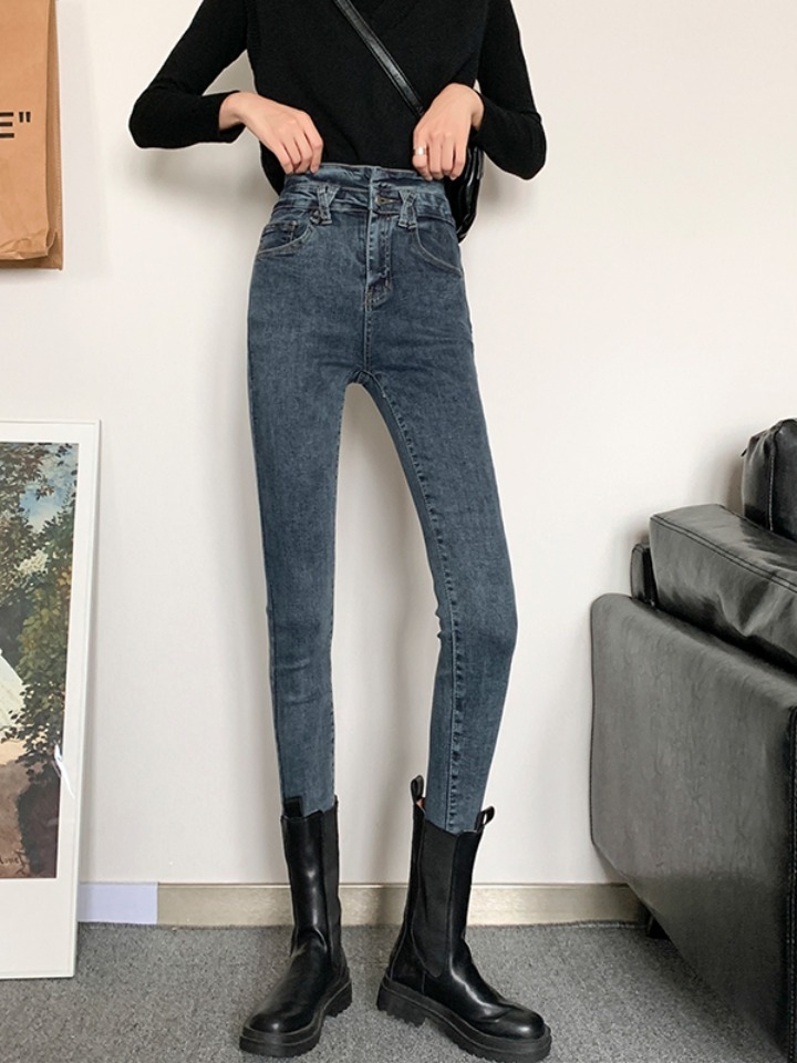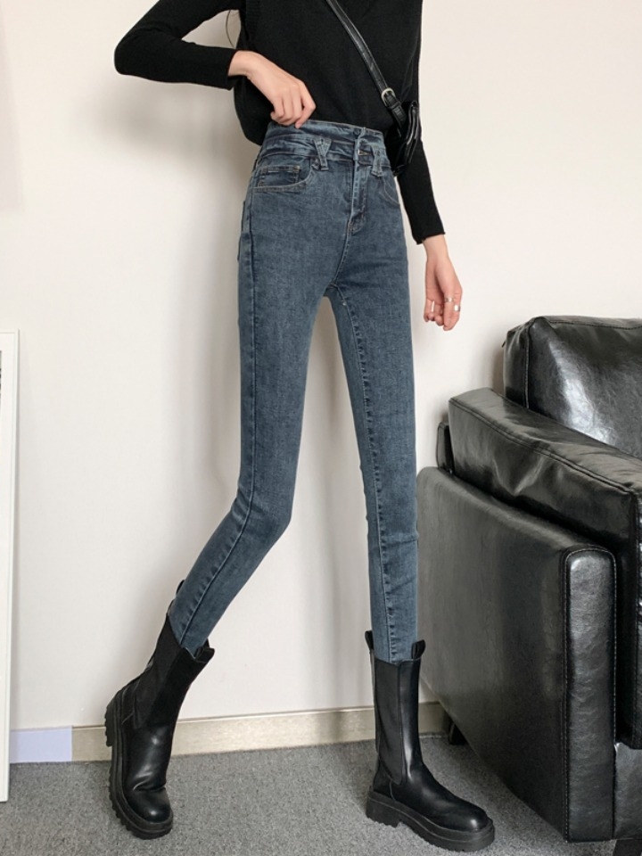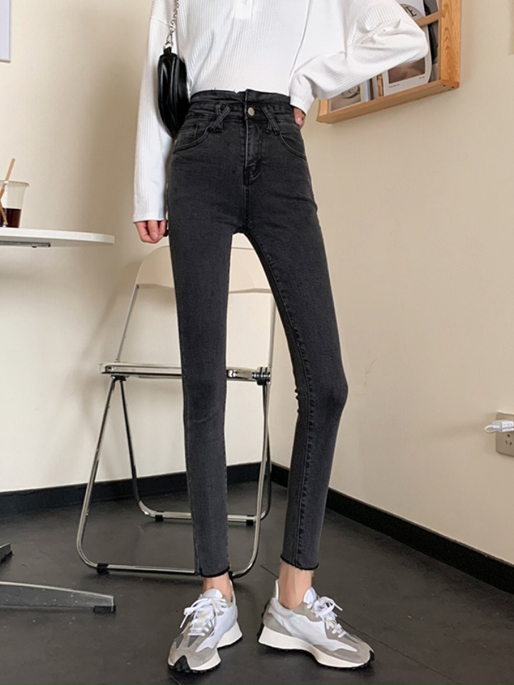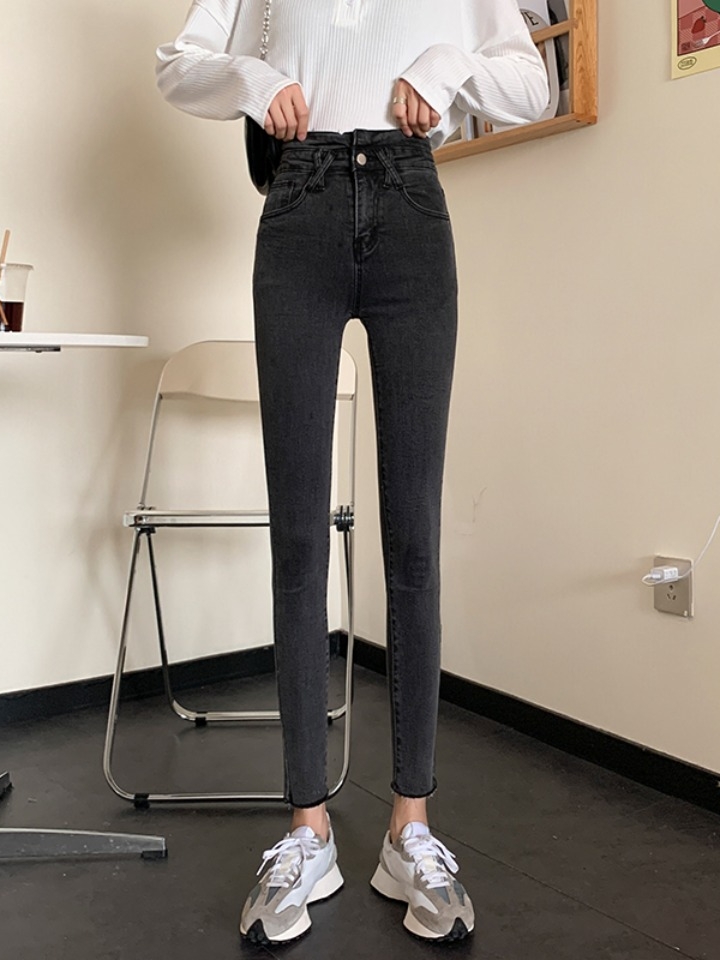 这款牛仔裤,简洁干练的九分长度,恰到好处的拉长腿部长度;高腰的版型,自然的将腰线上移,轻松显瘦。修身的小脚裤型,让双腿更为笔直。裤脚前短后长的破洞设计,也增加了几分时尚感。
