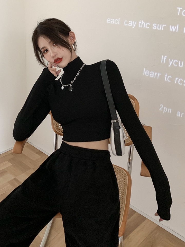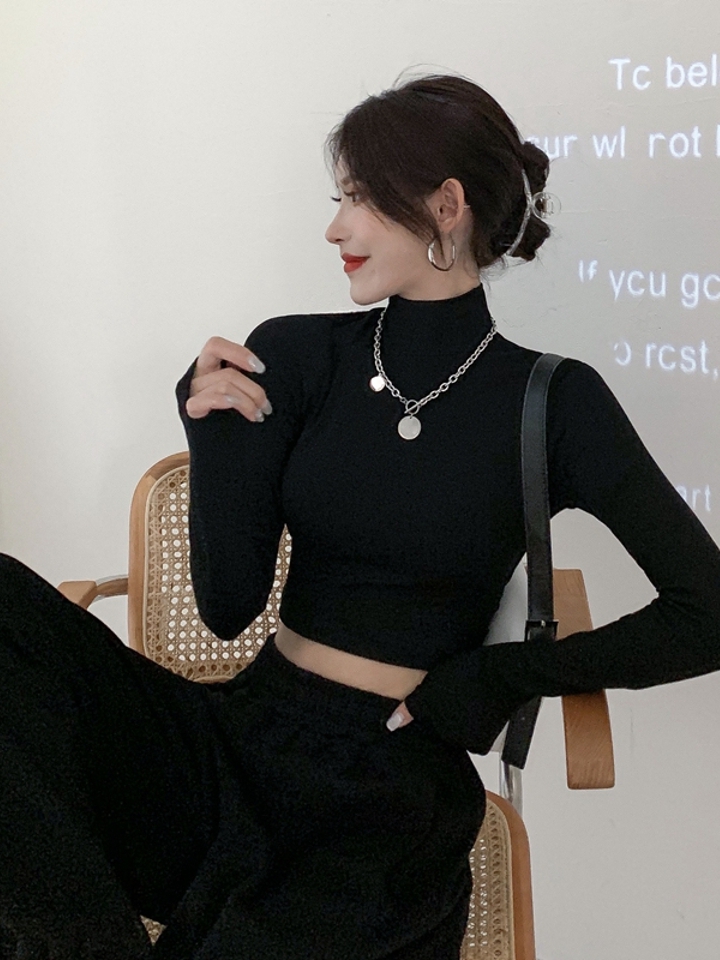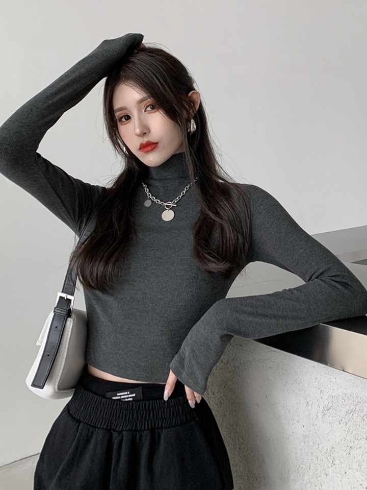 百搭纯色打底衫,舒适半高领,挺括又保暖。显露出女性柔美优雅气质。修身短款的版型