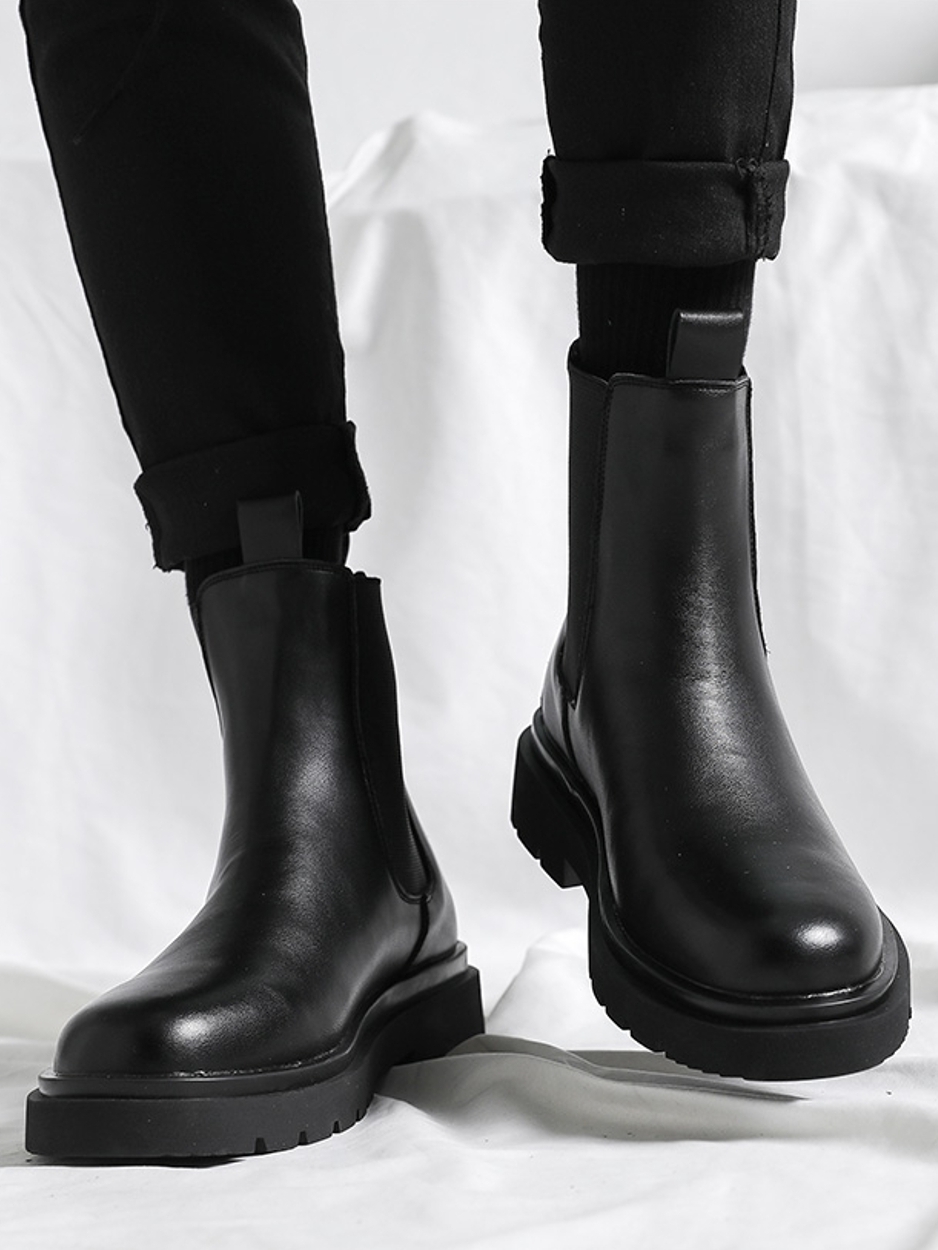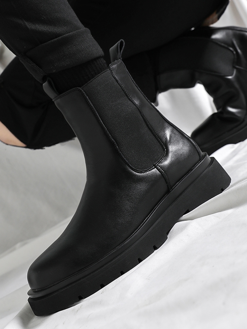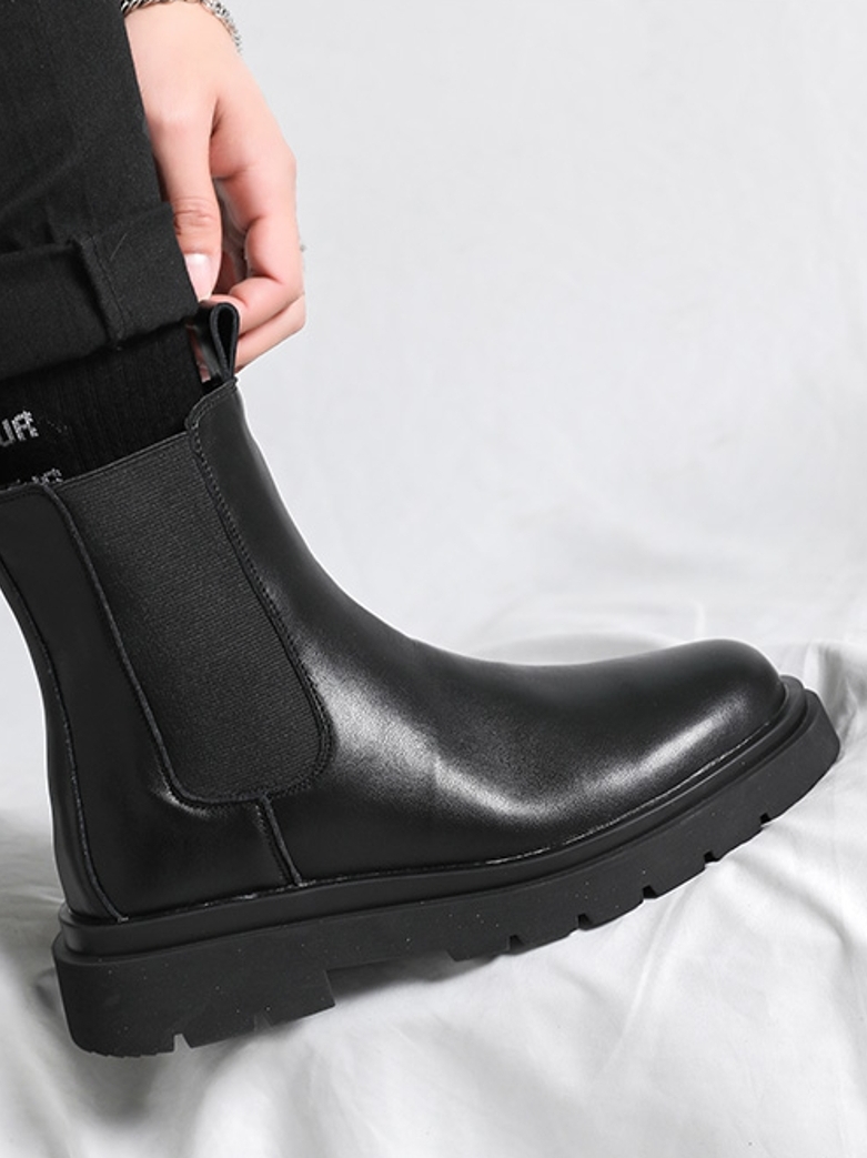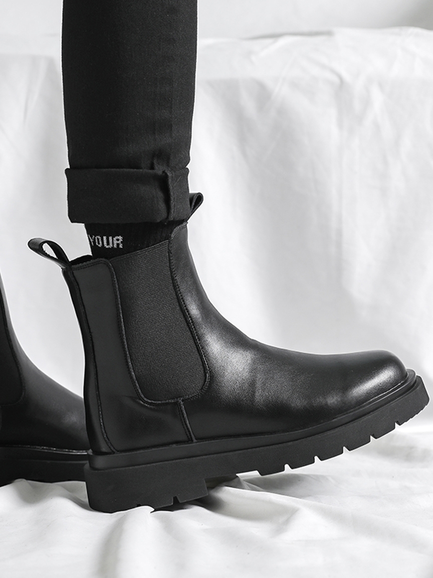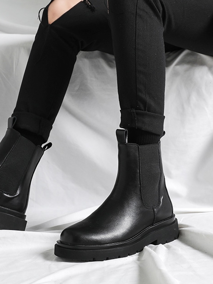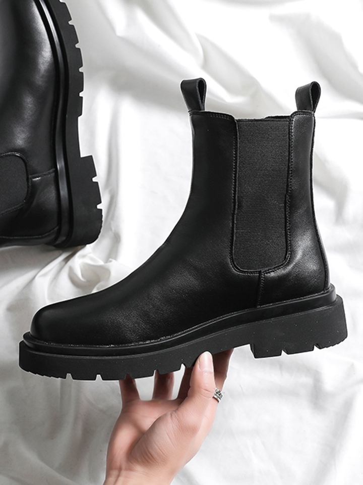 霸气潮流的马丁靴,除了质感出众的头层牛皮的材质,还有古典优雅的松紧织带拼接的套脚鞋楦。