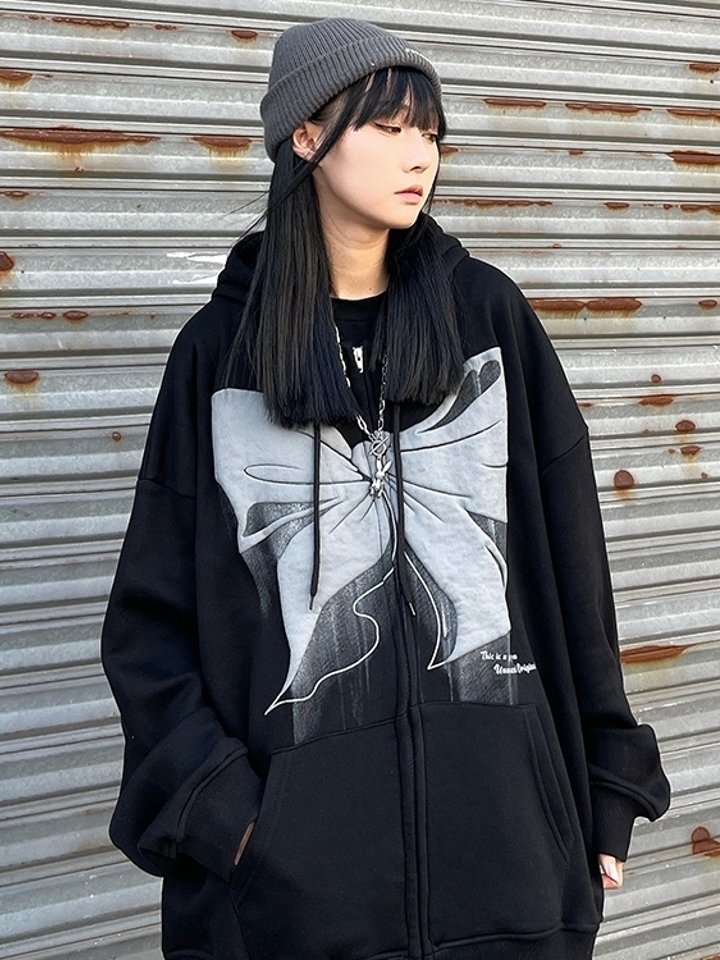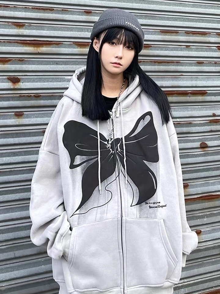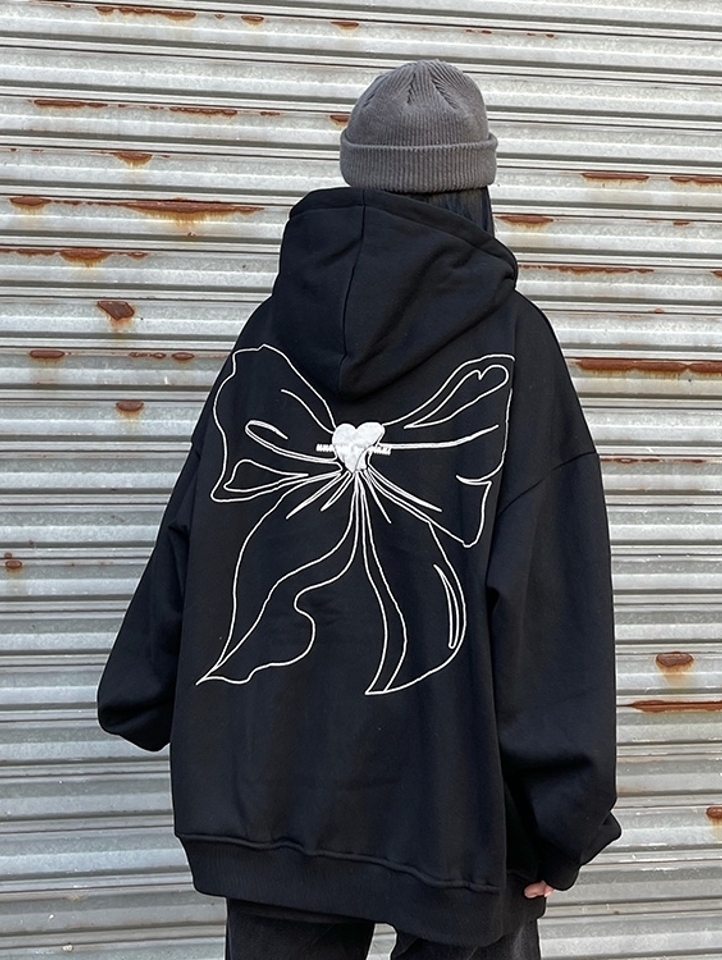 连帽领的设计,和卫衣版型相结合,将原本的休闲风范再次提升。和普通的卫衣版型不同之处在于,衣袖和后背位置上的蝴蝶结装饰。