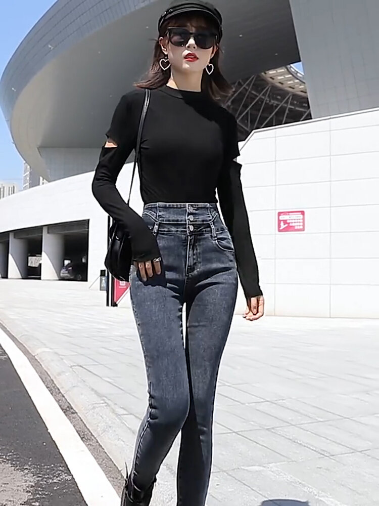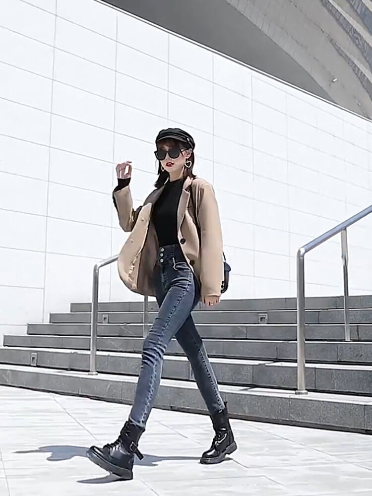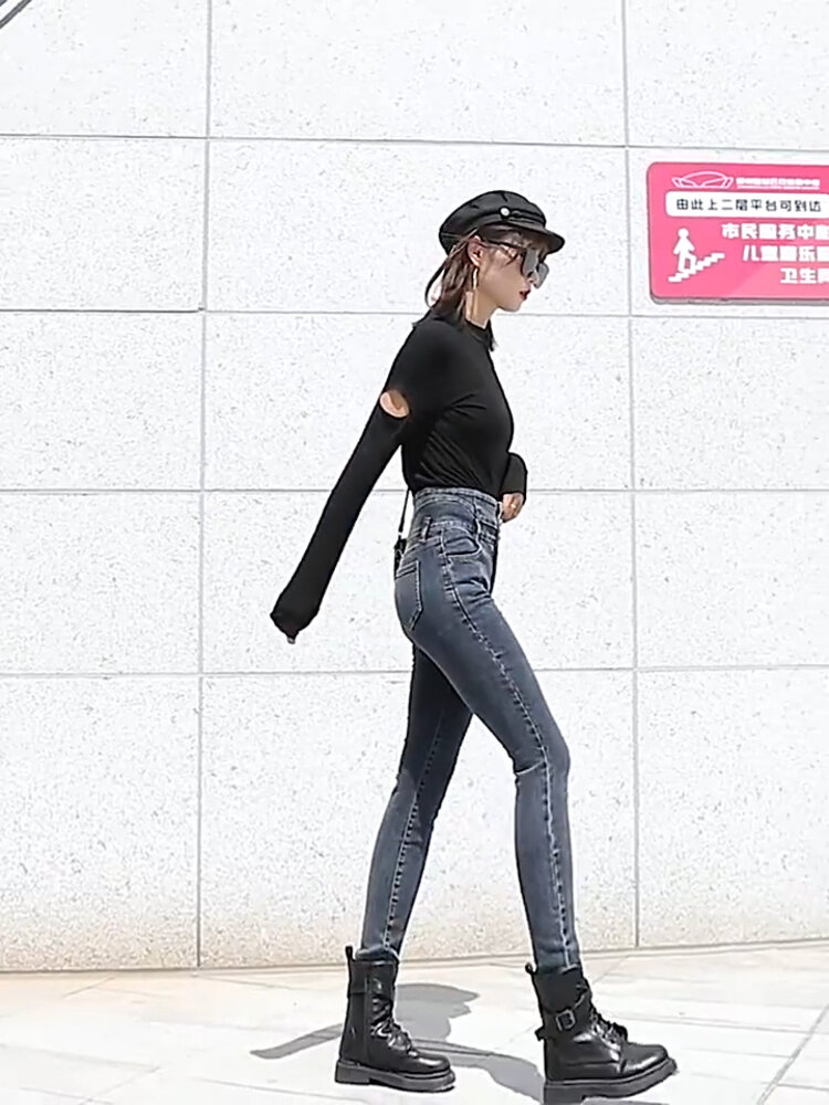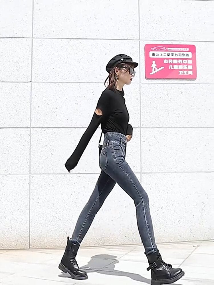 棉弹牛仔布舒适不紧绷,显瘦自然效果好,简单大方的版型实用百搭,背后的双口袋设计,提臀翘臀,弹力瘦腿九分裤型勾勒出纤长美腿。
