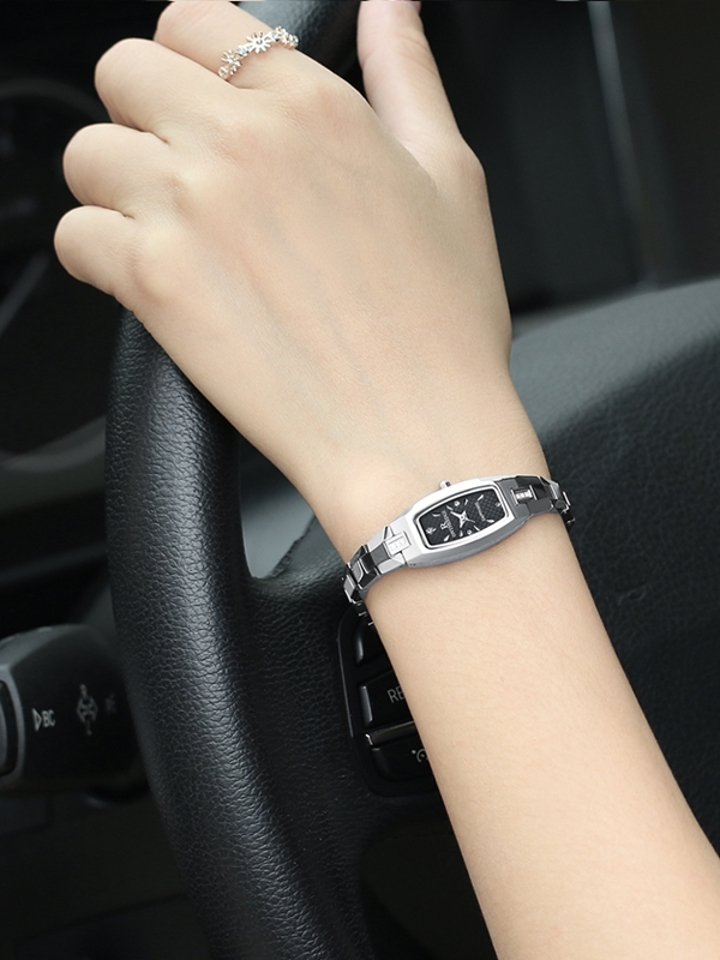 钨钢材质高档抢眼,自带光泽感,戴于手腕间倍显高大上。棱角分明的圆环有序拼接,彰显出精湛的工艺,更修饰着手腕的线条,展现柔美。