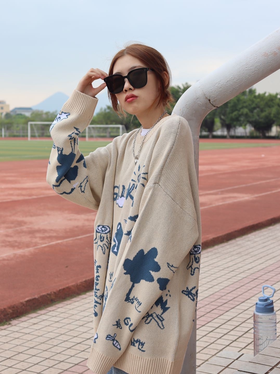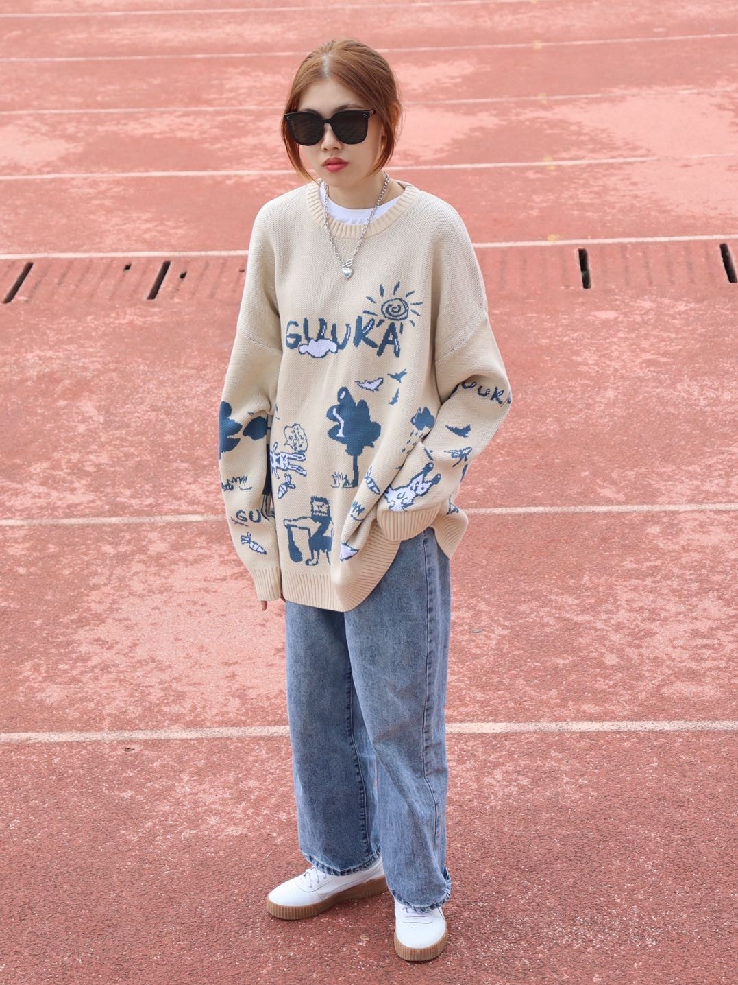 上面有着印花点缀的图案毛衣,可以尝试穿着一件宽松的牛仔裤,带来休闲韵味的气息。