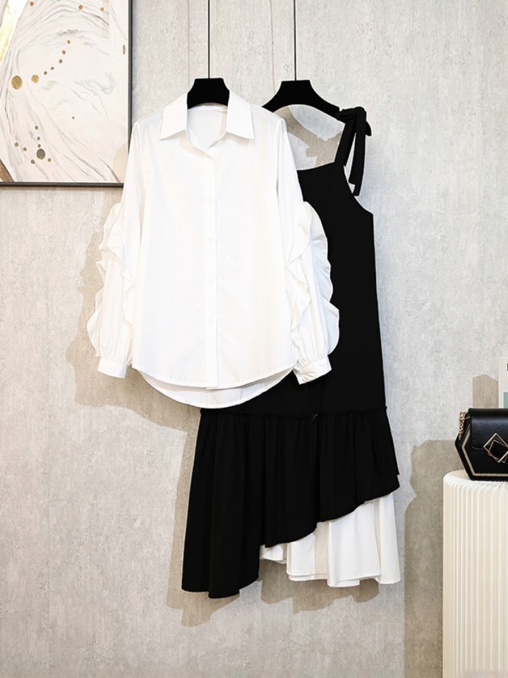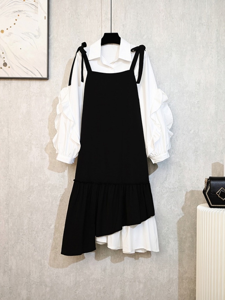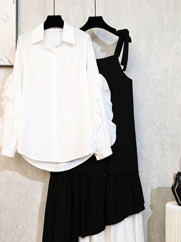 超级减龄的学院风两件套,舒适的翻领设计,简洁干练,文艺气质十足喇叭松紧袖口,搭配蝴蝶结可拆卸系带,青春甜美哦,竖条纹的衬衫上身很显瘦呢,搭配圆领背心裙,清新减龄,在早秋穿有别样的风情,分开穿搭配不一样的衬衫或是T恤都是妥妥的哦~