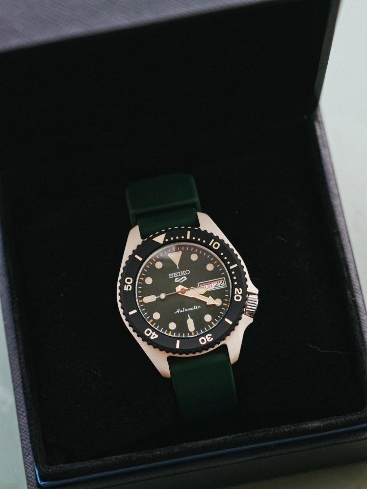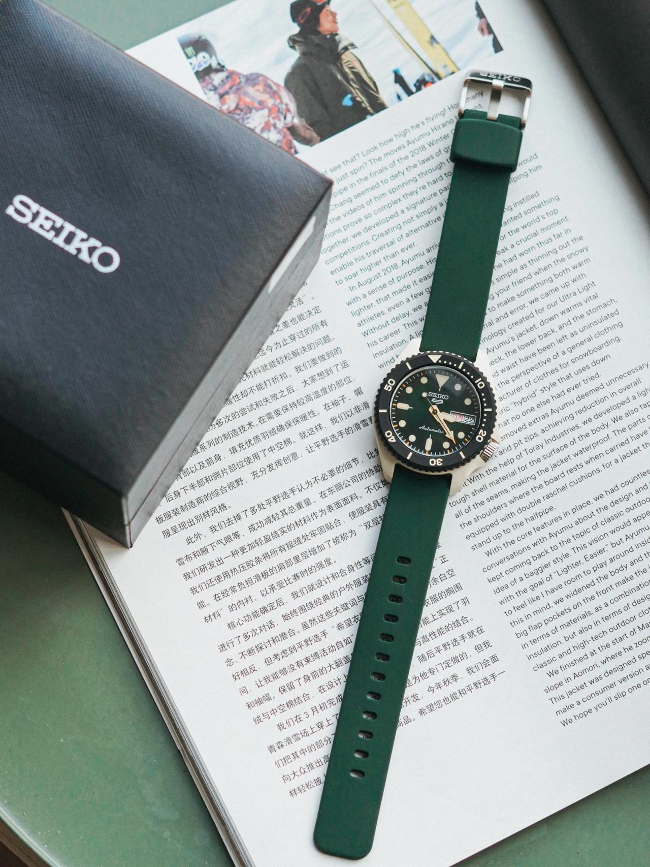 墨绿色的表带很亮眼n而且超好搭衣服的!n我记得第一天带n已经不断引起身边朋友注意到我的新手表了n*