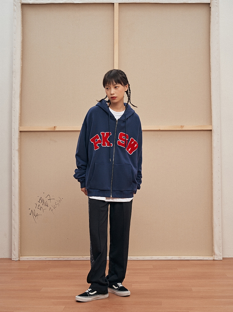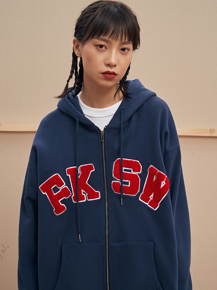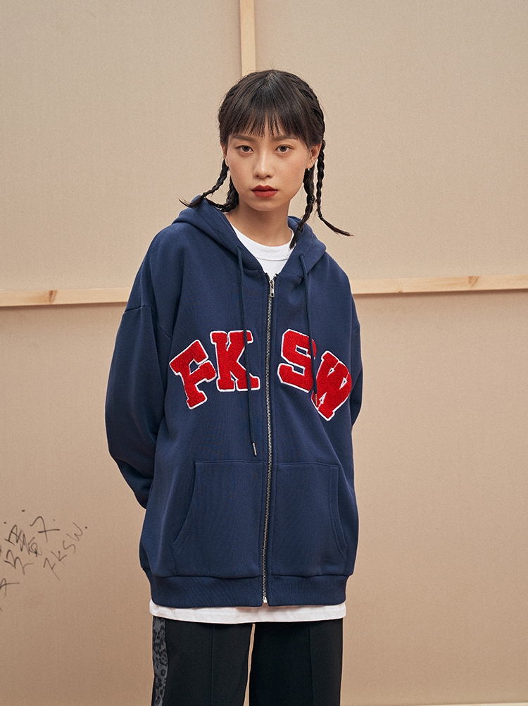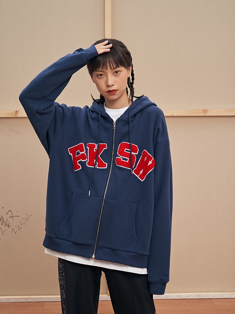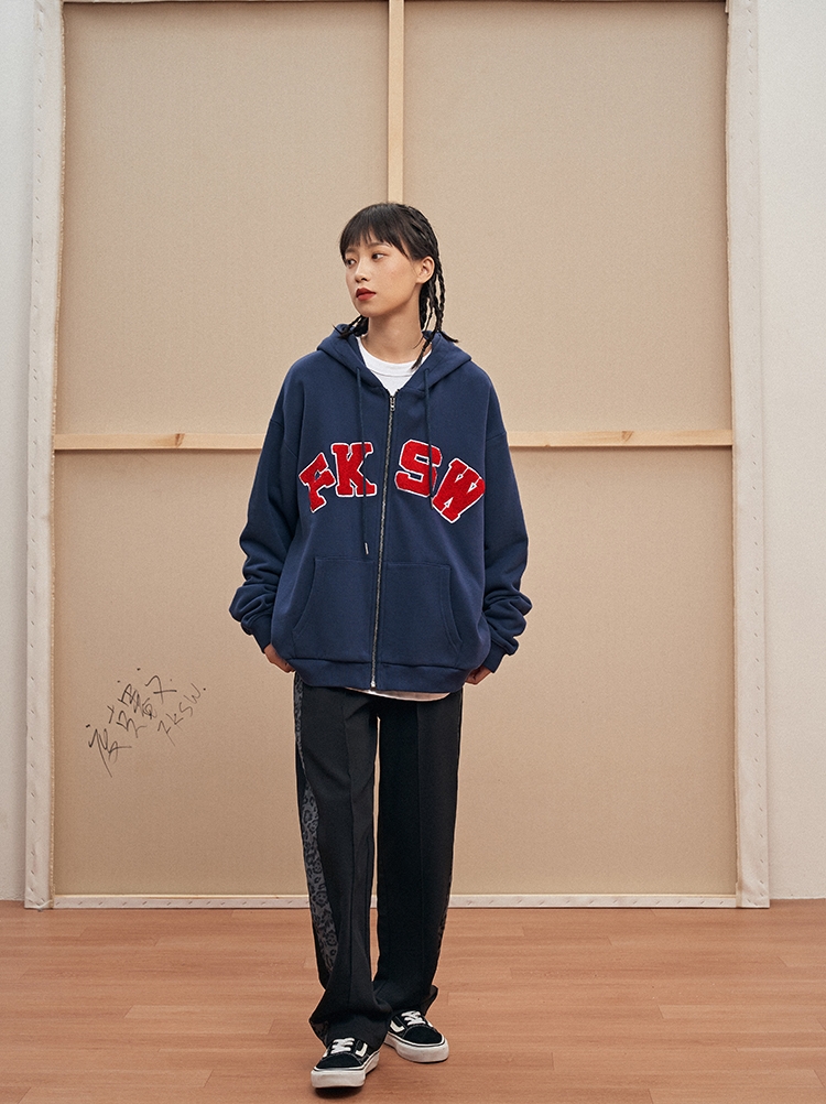 这款连帽卫衣开衫,运用鲜艳的红色布料制作,呈现出活力非凡的视觉效果;背后加入了个性的字母印花装饰,结合删除线的设计,更显个性。