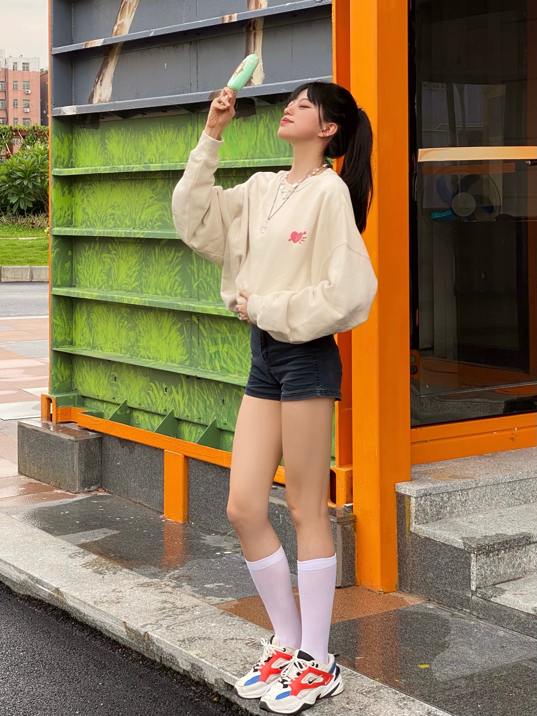 高腰的设计,拉长腿部线条,显瘦效果很好,高腰的版型,很显高挑,修身的剪裁,修饰腿部曲线,上身很有范。