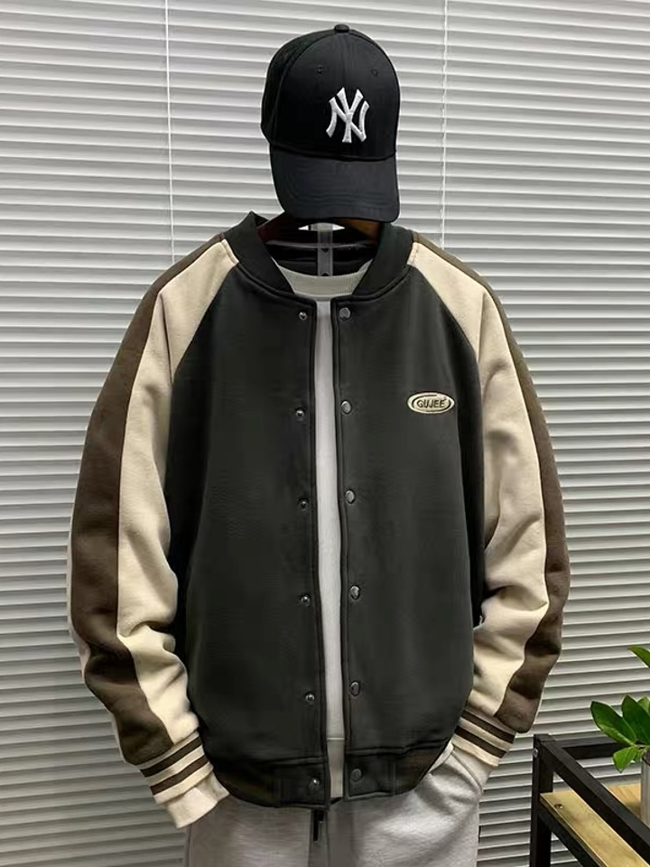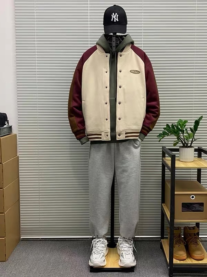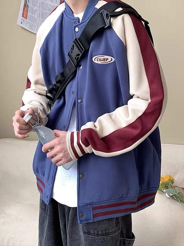 有精致的羽毛球绣花,背后充满个性的红白拼色刺绣字母,可以看出设计师的独特用心。宽松的版型搭配时髦的棒球立领,演绎出青春潮男装扮。