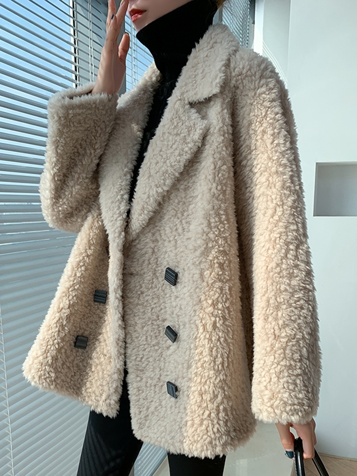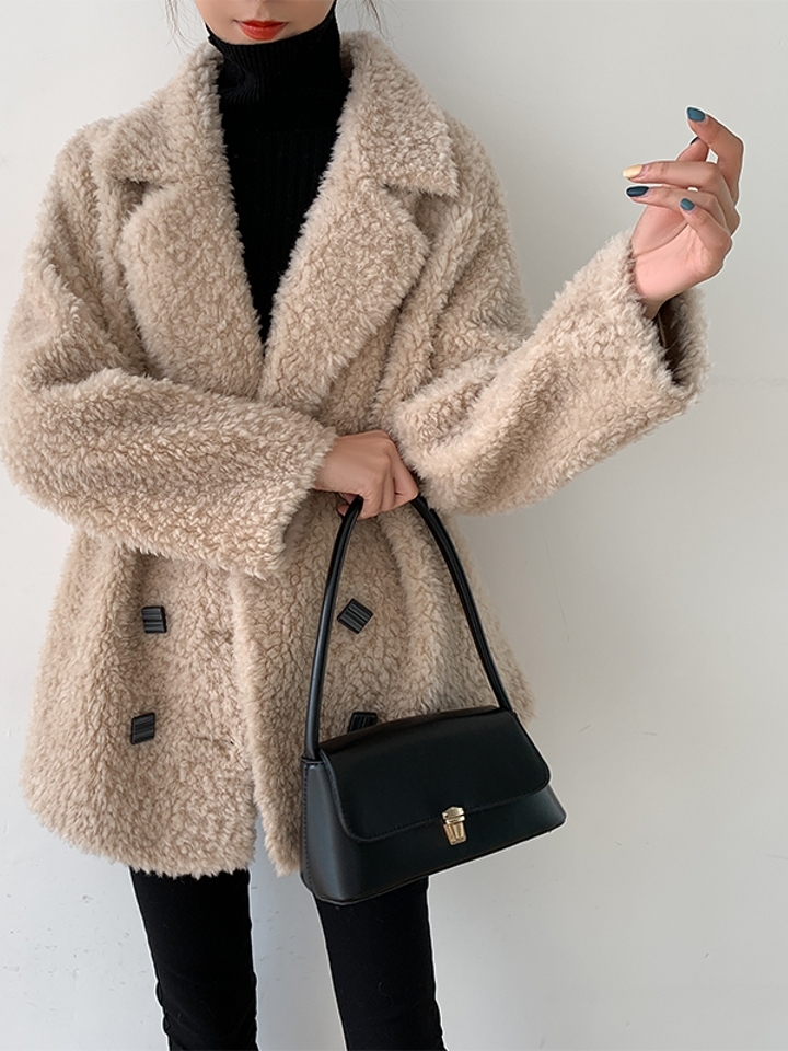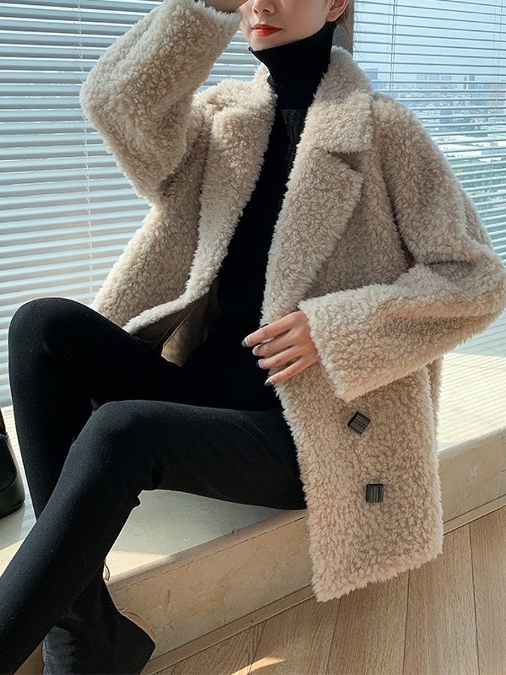 皮毛一体的大衣,拥有时尚大气的外观,而宽松的版型,适合各种身材的女性穿着,优雅的翻领设计,尽显女性颈部线条,优美迷人。