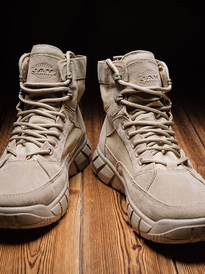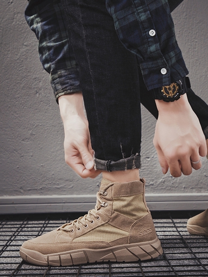 一款霸气十足的男士短筒工装靴,采用头层疯马牛皮制作,皮质厚实,表面带有明显的做旧纹理和擦痕,与整体的粗犷硬朗风格相呼应,鞋面还加入褶皱工艺,