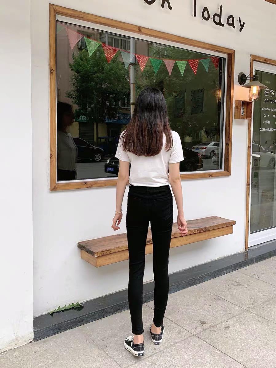 高腰的设计,拉长腿部线条,显瘦效果很好,高腰的版型,很显高挑,修身的剪裁,修饰腿部曲线,上身很有范。