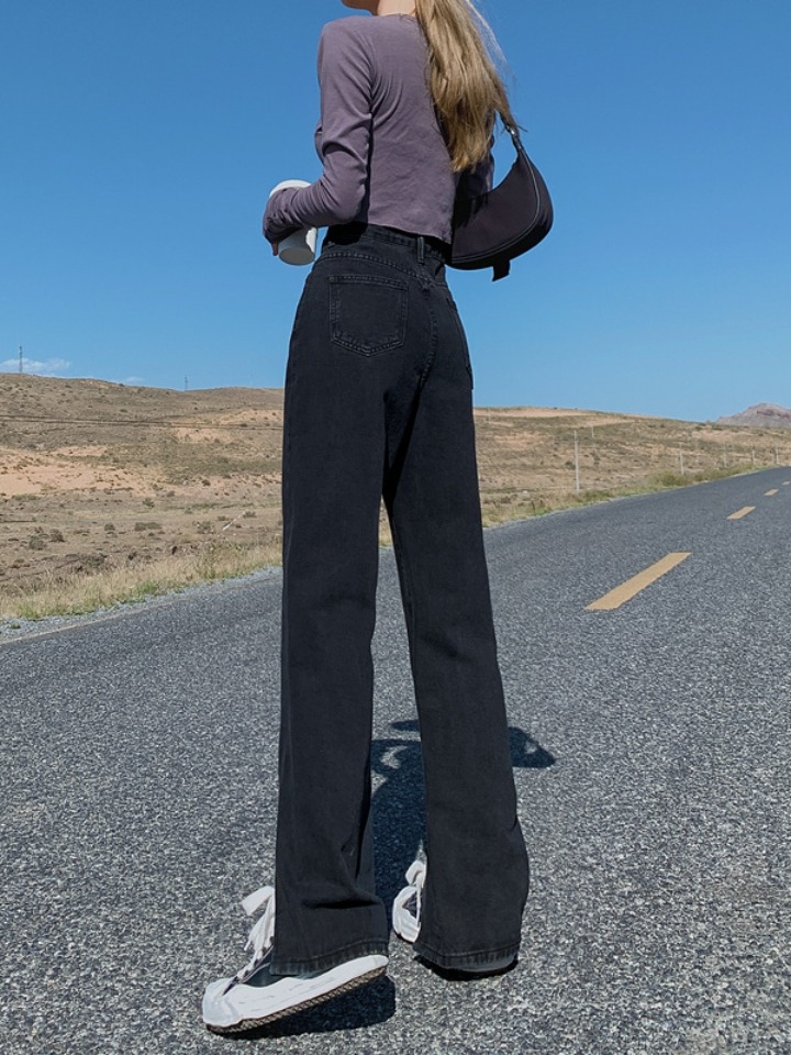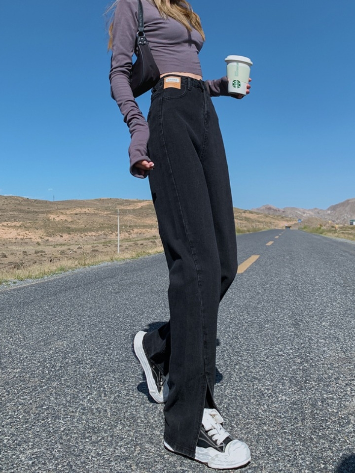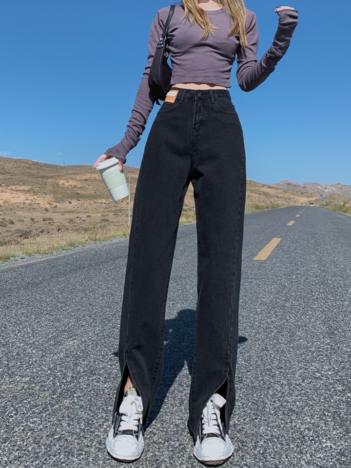 高腰设计,拉长身材比例。高腰牛仔裤,显瘦显腿长。直筒裤型,修饰腿部线条。