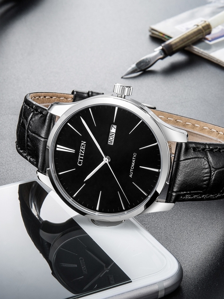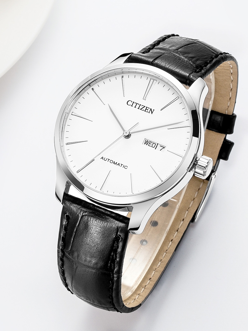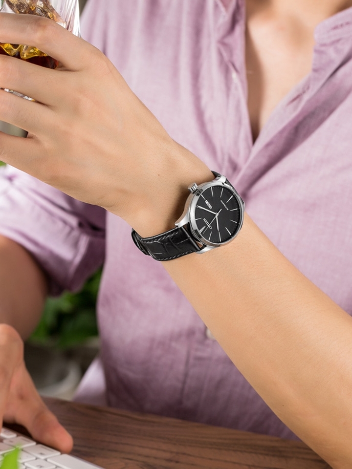 这款男士机械手表,采用有机玻璃镜面,精钢表壳,配以透气真皮表带,腕表质感可鉴,无可挑剔。简单的指针式表盘,黑色或白色色底,低调优雅,凸显男士不俗的品位生活。