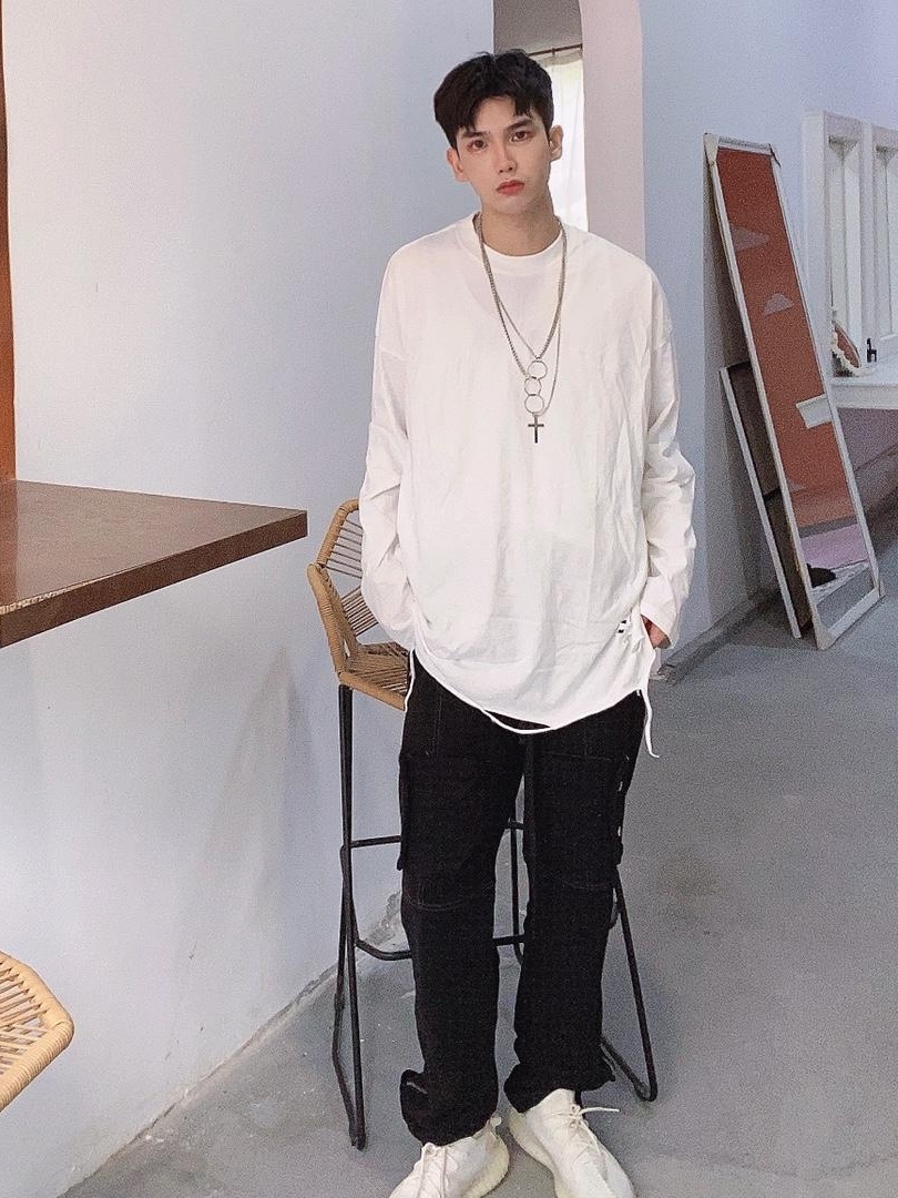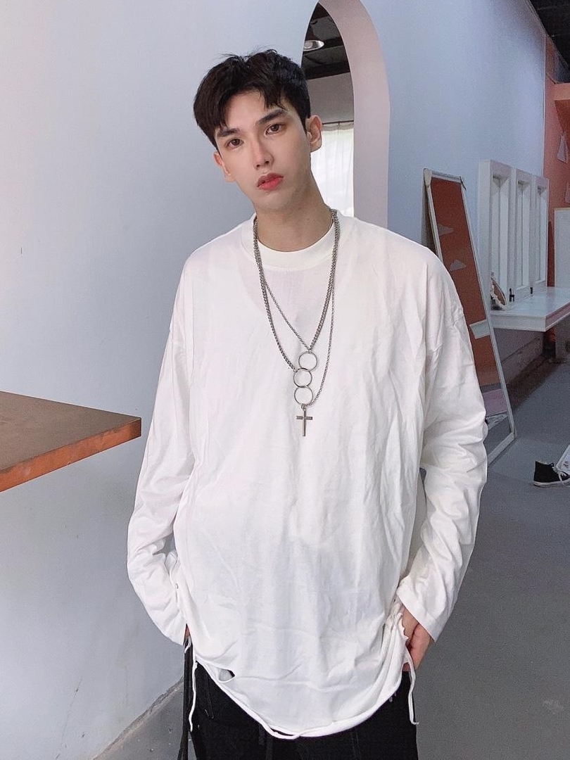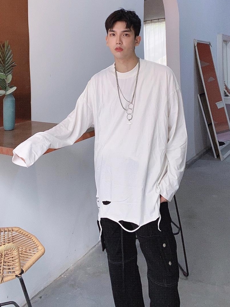 宽松的版型结合落肩袖的设计,慵懒随性无约束感。宽松的款式结合当下流行的下摆破洞元素设计,很好地与时尚潮流相呼应,散发型男魅力。
