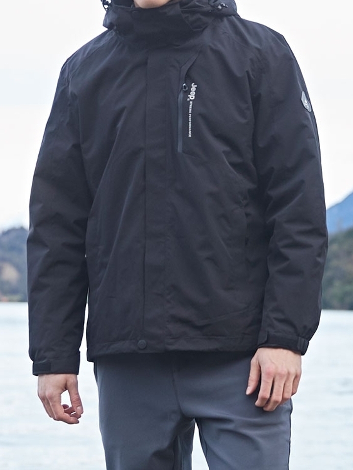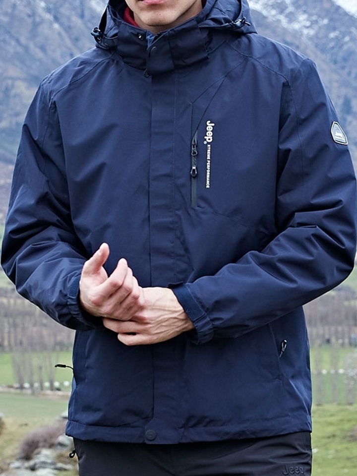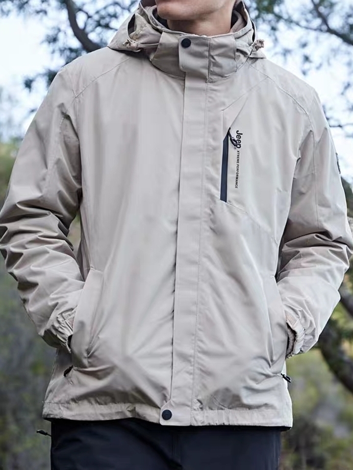 户外三合一冲锋衣,整体采用撞色拼接工艺制作,有效提升视觉识别能力,增强户外安全性能。