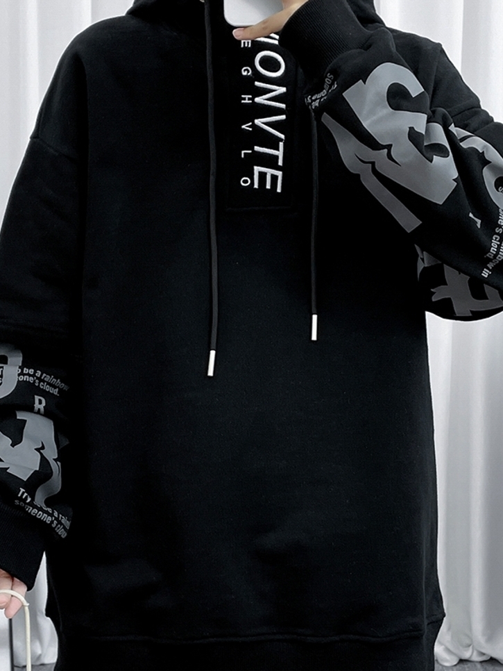 假两件的设计,让纯黑的衣身也富有层次感,低调之中不失自身的魅力。这是一件长款卫衣,连帽,长袖,没有太明显的拼接线条。