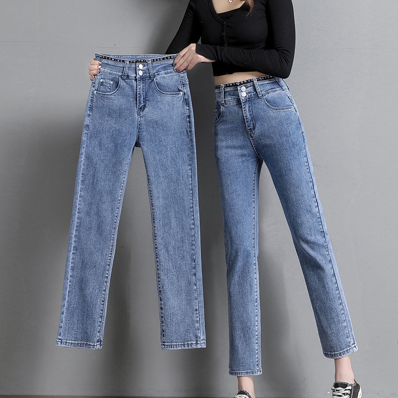 高腰设计,拉长身材比例。高腰牛仔裤,显瘦显腿长。直筒裤型,修饰腿部线条。