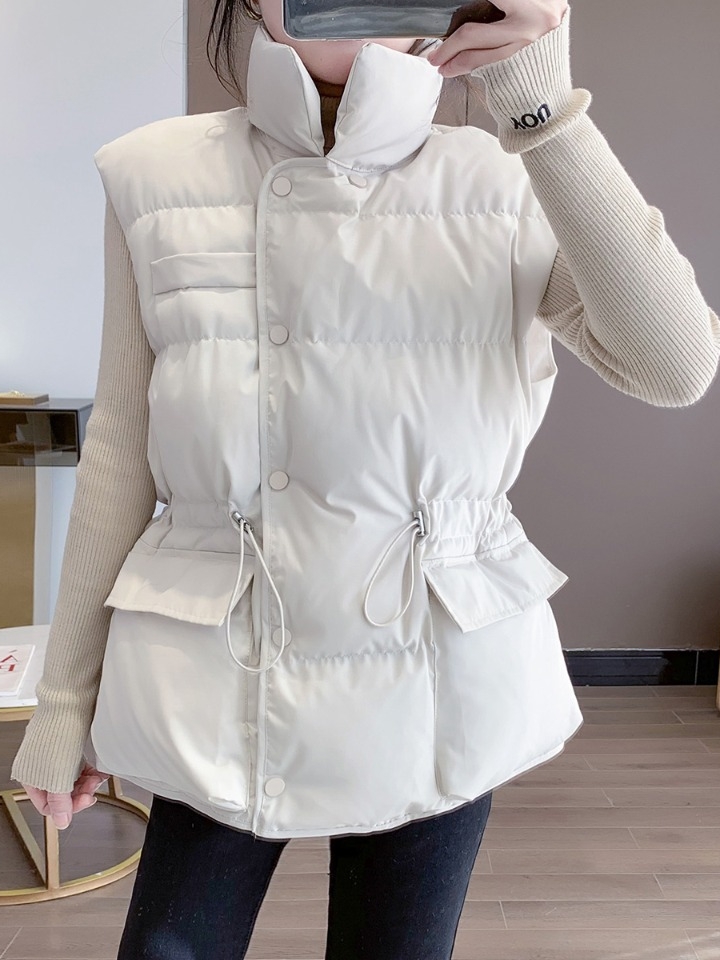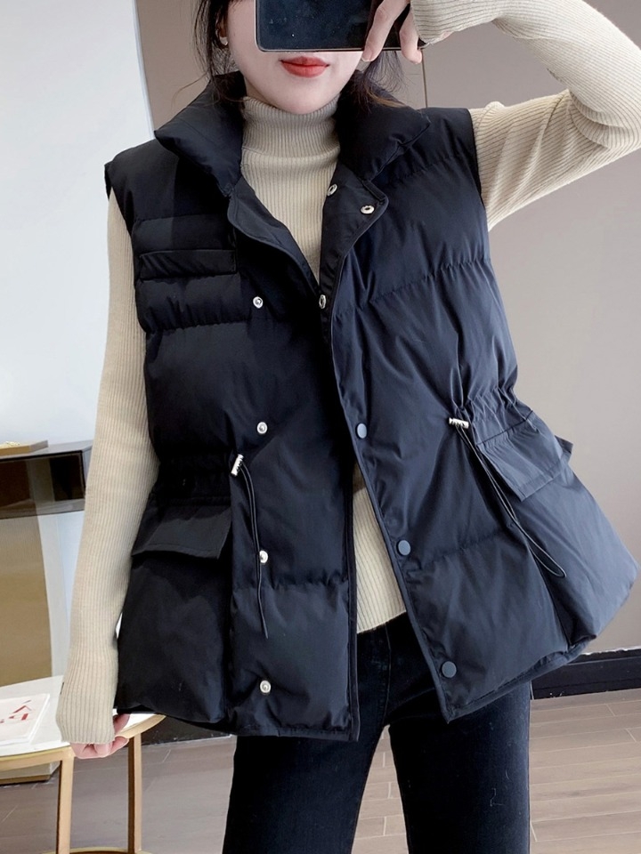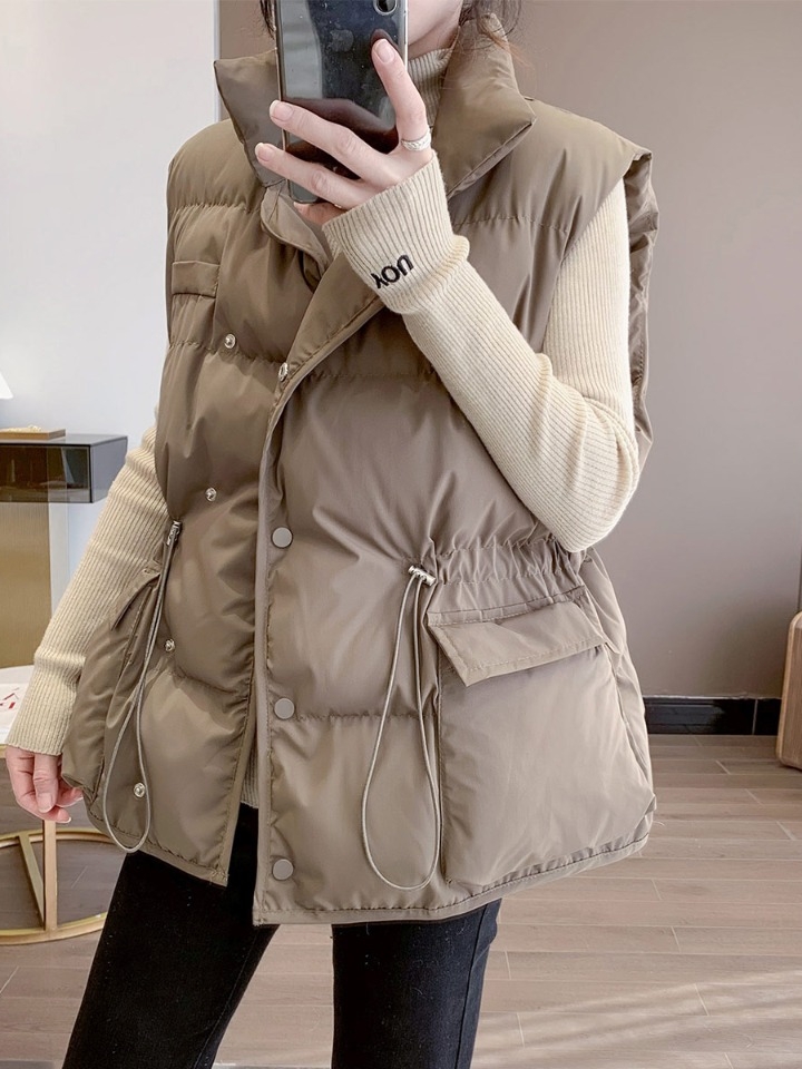 简约而不简单的马甲,立领的设计,可以给予颈部更多的温暖,同时在衣身上做了抽绳的设计,能够勾勒出你曼妙迷人的身姿,让你更具女人味。