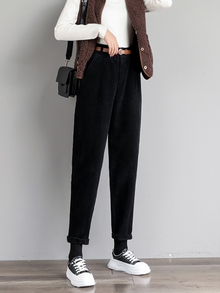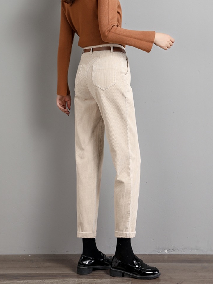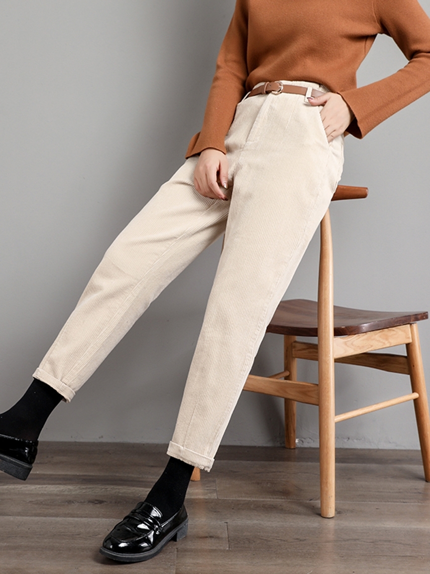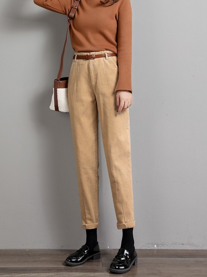 纯色色调搭配,清新自然,优质灯芯绒面料运用,柔软舒适,防寒保暖,加厚设计更加温暖,宽松直筒版型,柔和腿部线条,显瘦神器,高腰款式,拉高腰线,更佳修长,文艺复古得穿搭!很百搭!