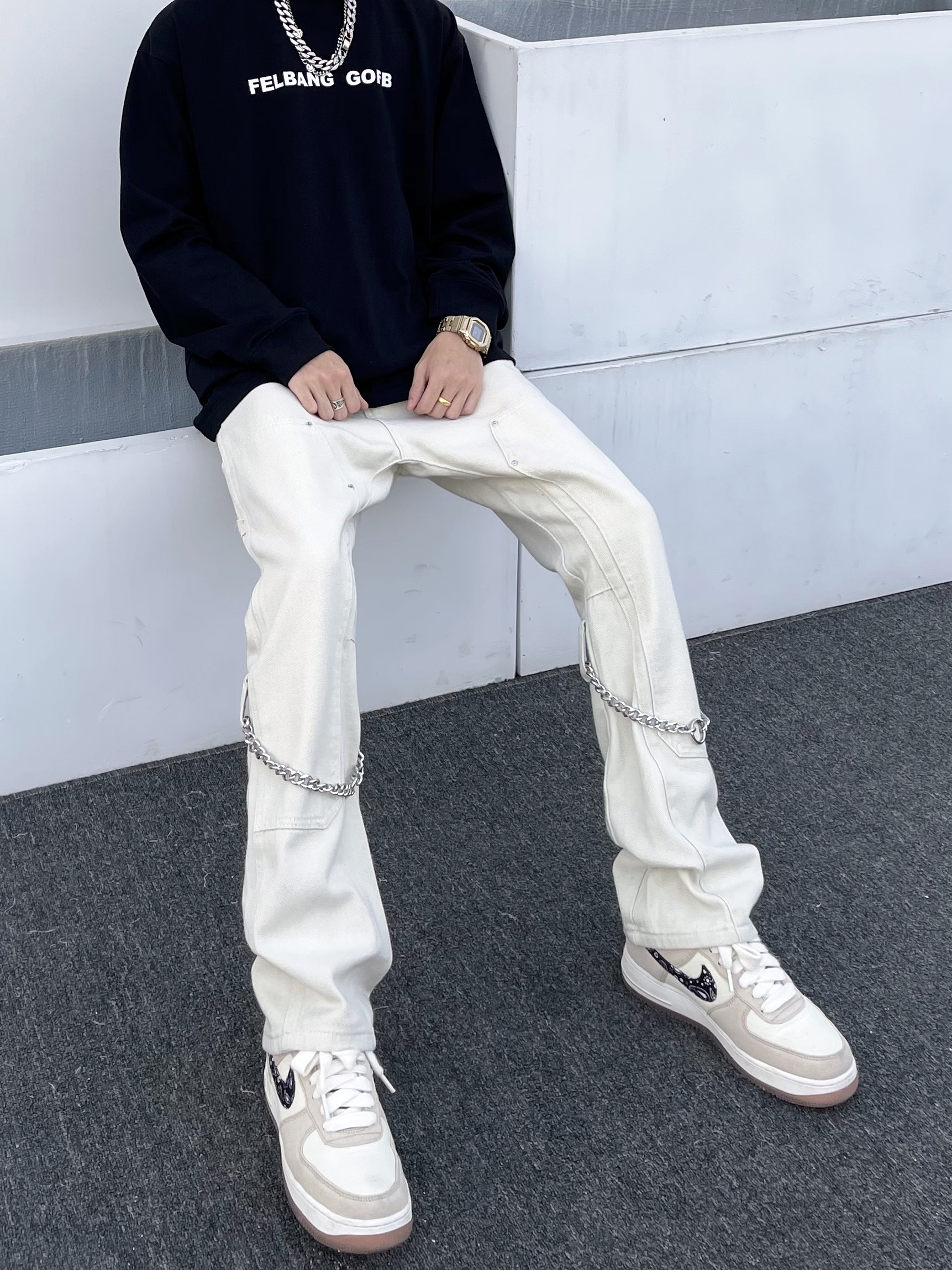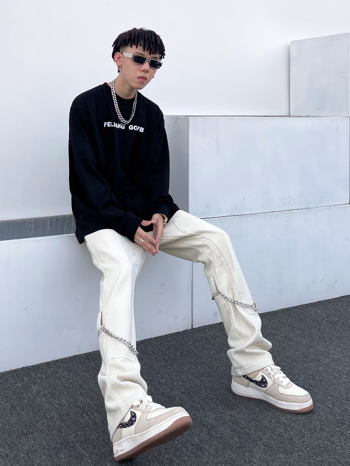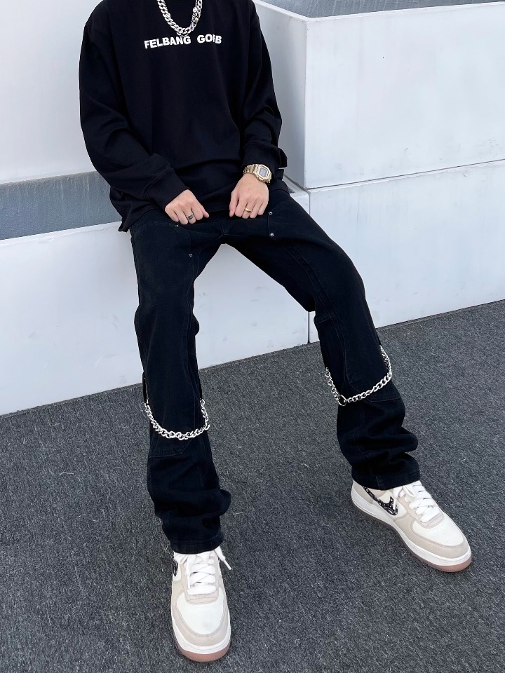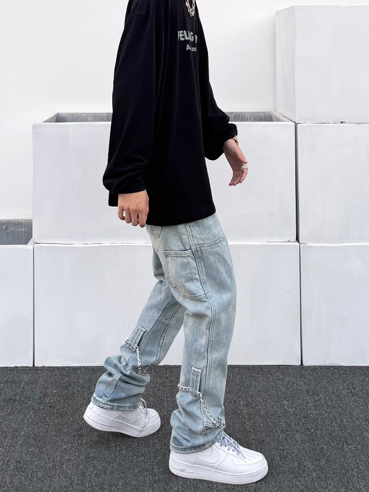 采用美化曲线的中腰位设计,舒适自在。破洞的牛仔裤总有种不羁的调调,加上高质感的链条让颓废感来得更加猛烈一些。舒适的裤型最适合打造不羁的街头风格,显得活泼、休闲舒适的感觉。