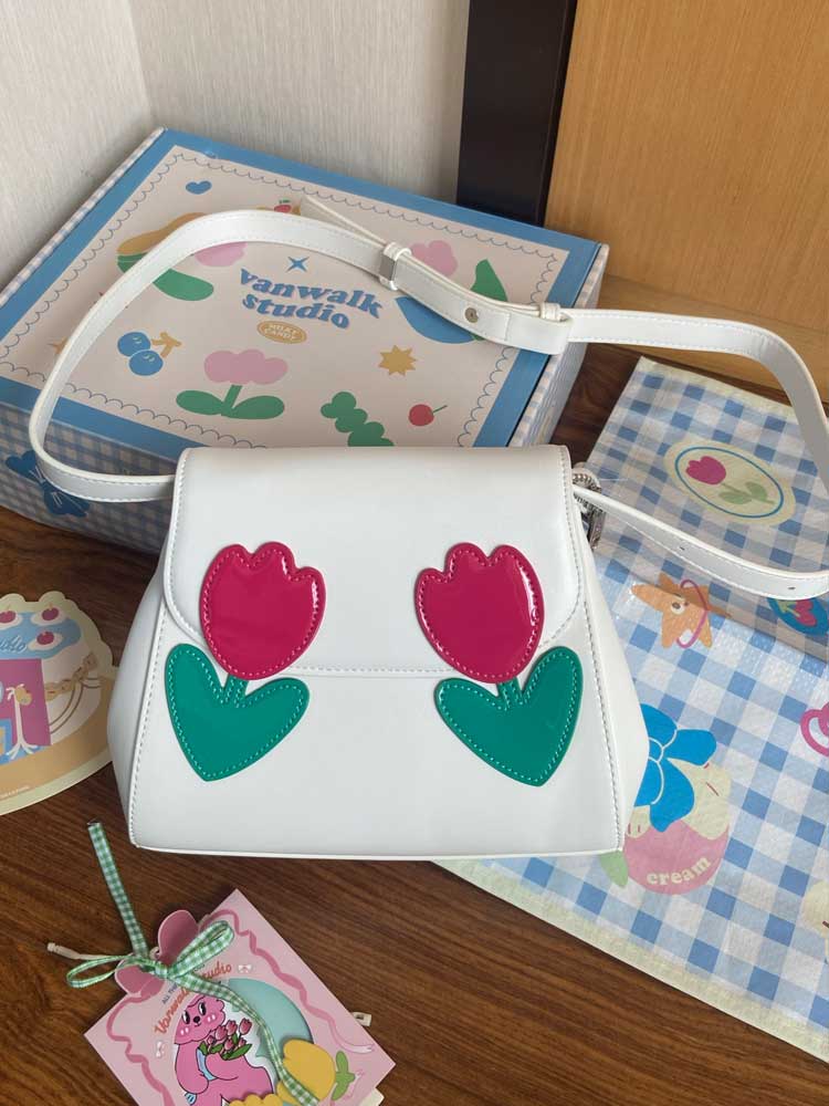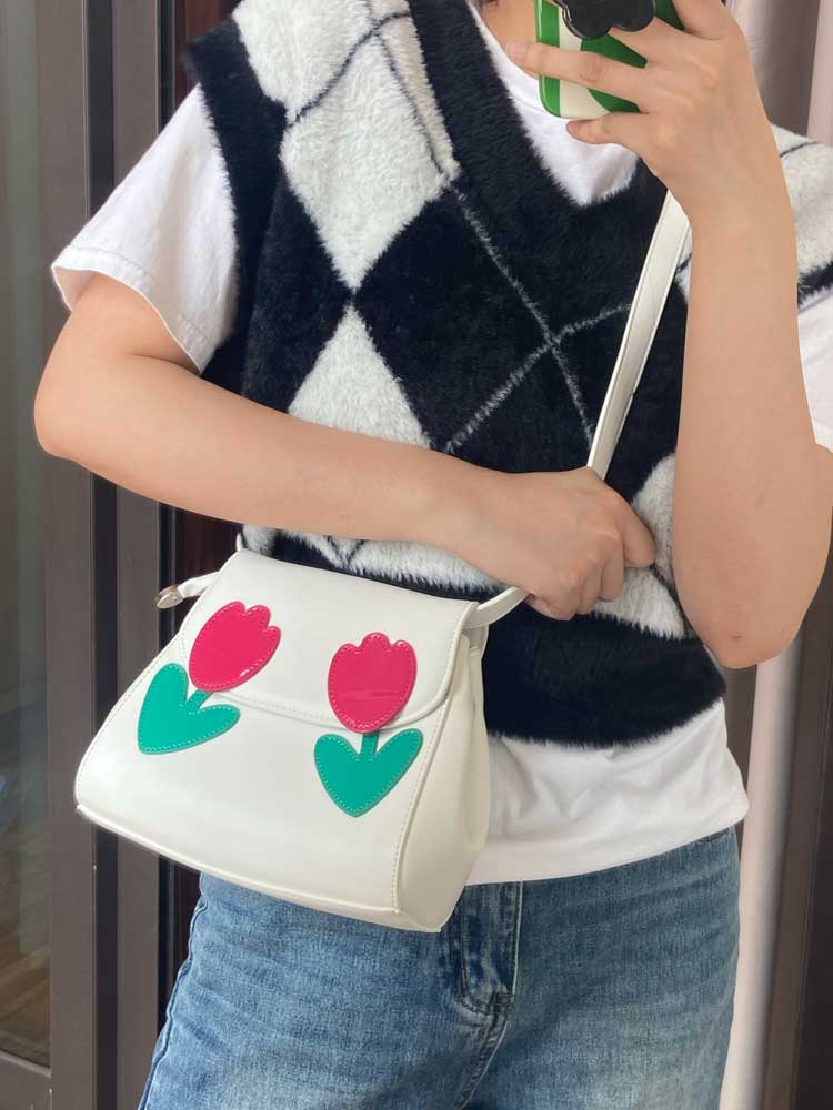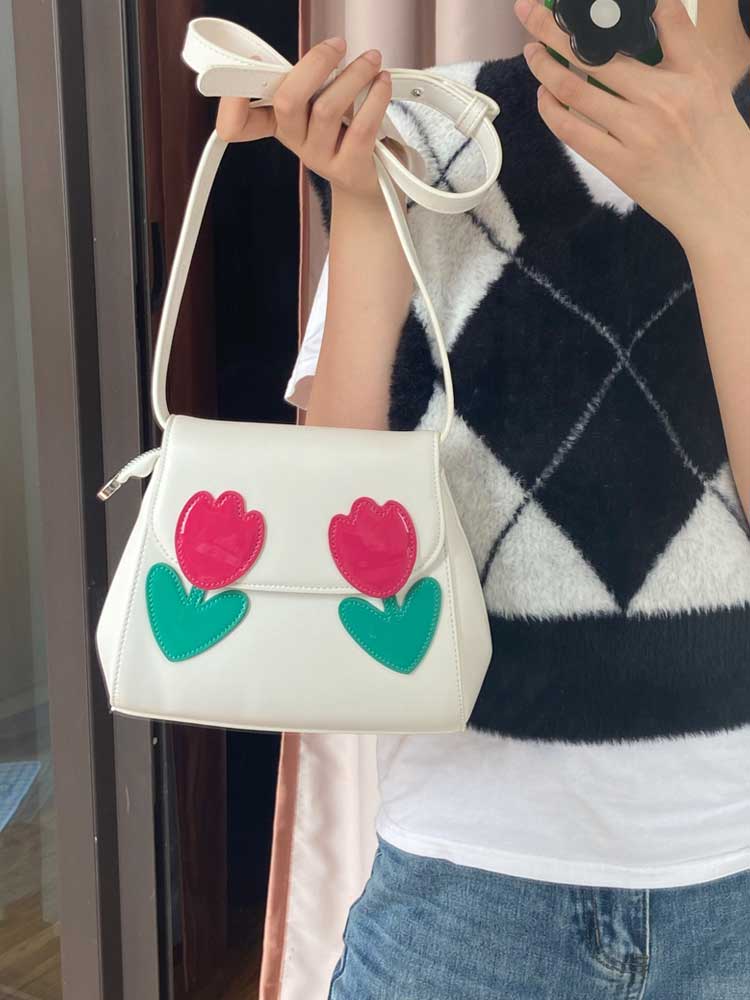 一眼就看上的包包 ,郁金香真的太喜欢了 整个包温温柔柔的 。包包是很小巧的贝壳包造型,上面两朵撞色的郁金香小花花,配色超清新。