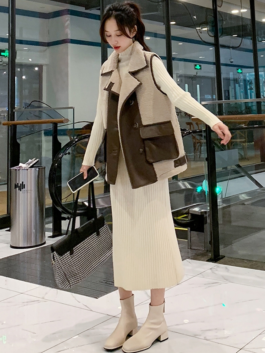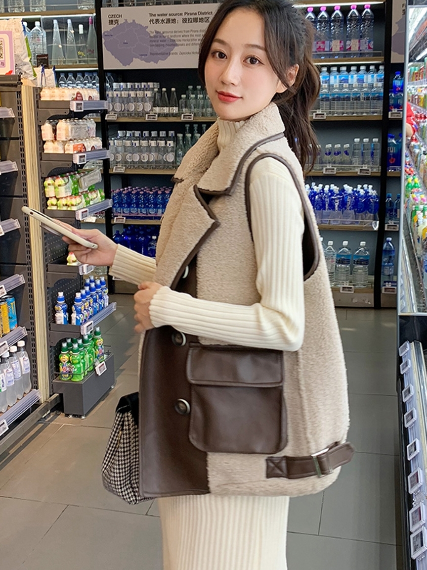 这件拼接马甲特别的适合在秋季穿,栗色系的看上去就特别的温暖,羊羔毛的拼接摸起来手感舒适,也特别的保暖。
