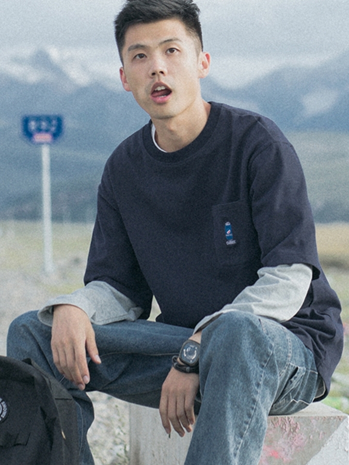 这款卫衣是假两件的哦,很休闲还透露这一丝慵懒随意的调调,卫衣的本身还是很简约的设计 ,袖子撞色的拼接,给人很休闲的感觉。