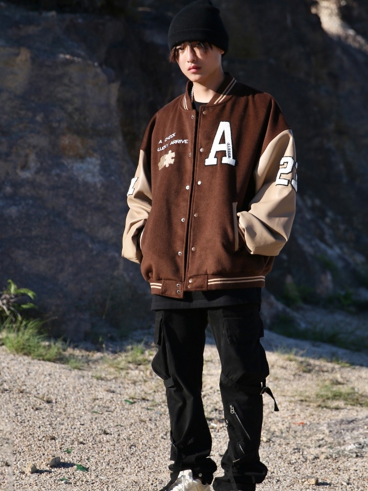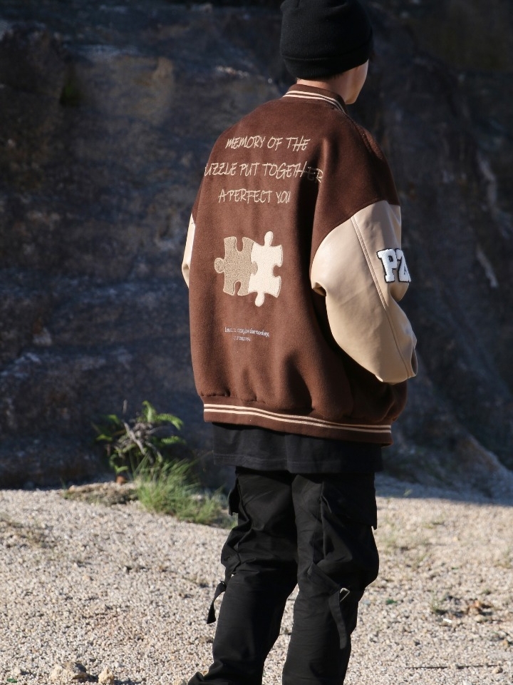此款夹克选用了经典的棒球领款式,可以更好的贴合脖颈完美线条,提高舒适度,并起到一定的保暖效果,胸前及袖臂采用了精致徽章贴布装饰,个性十足。