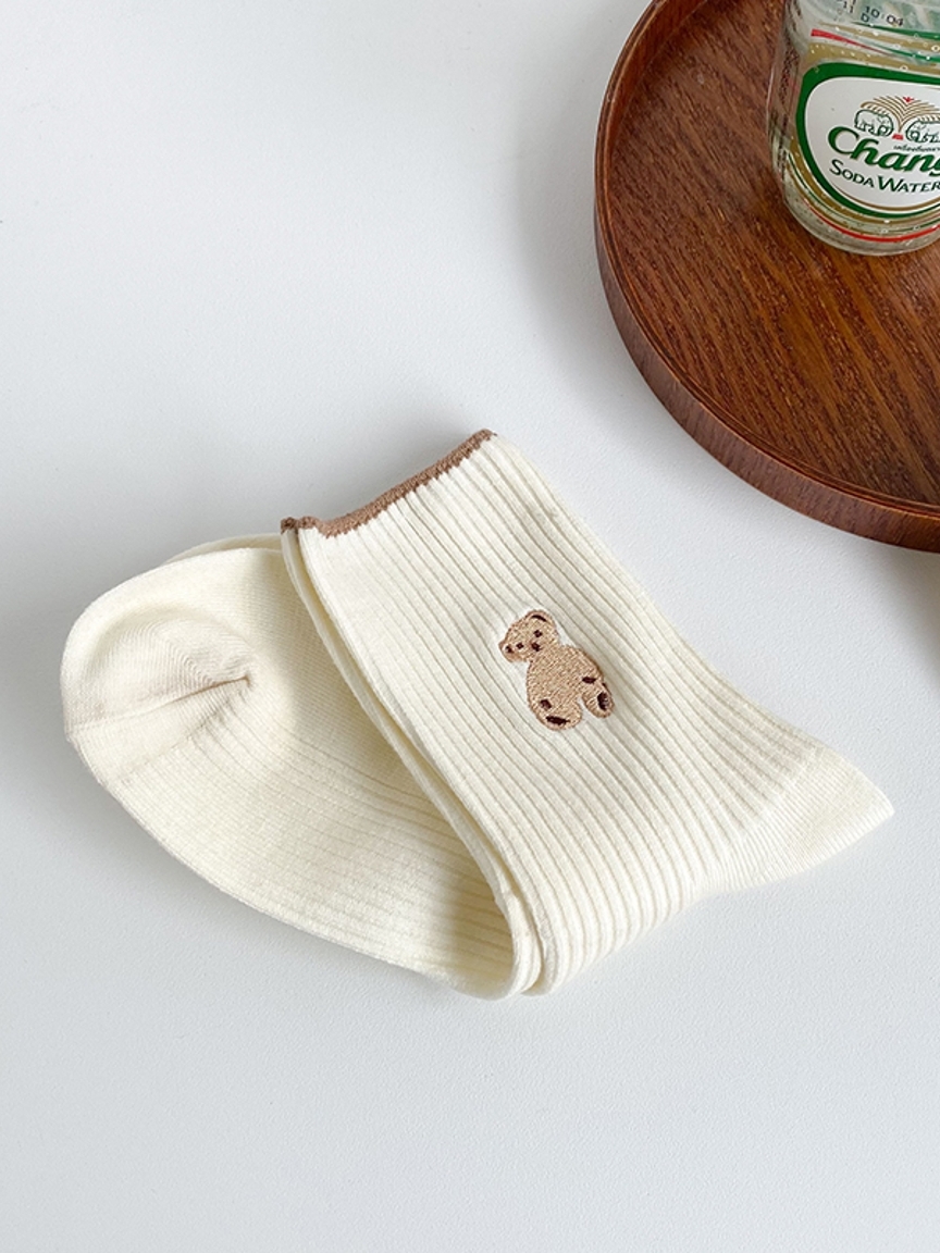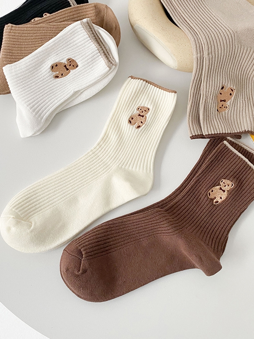 一款日系风格的小熊堆堆袜,中筒的设计,很好的呵护了脚踝,穿上舒适又美观,坑条的纹理设计,显得很是美观时尚。