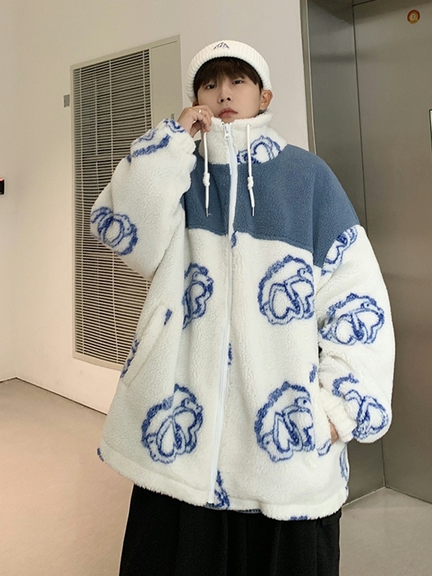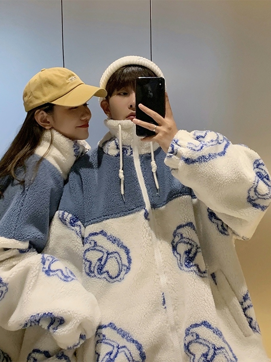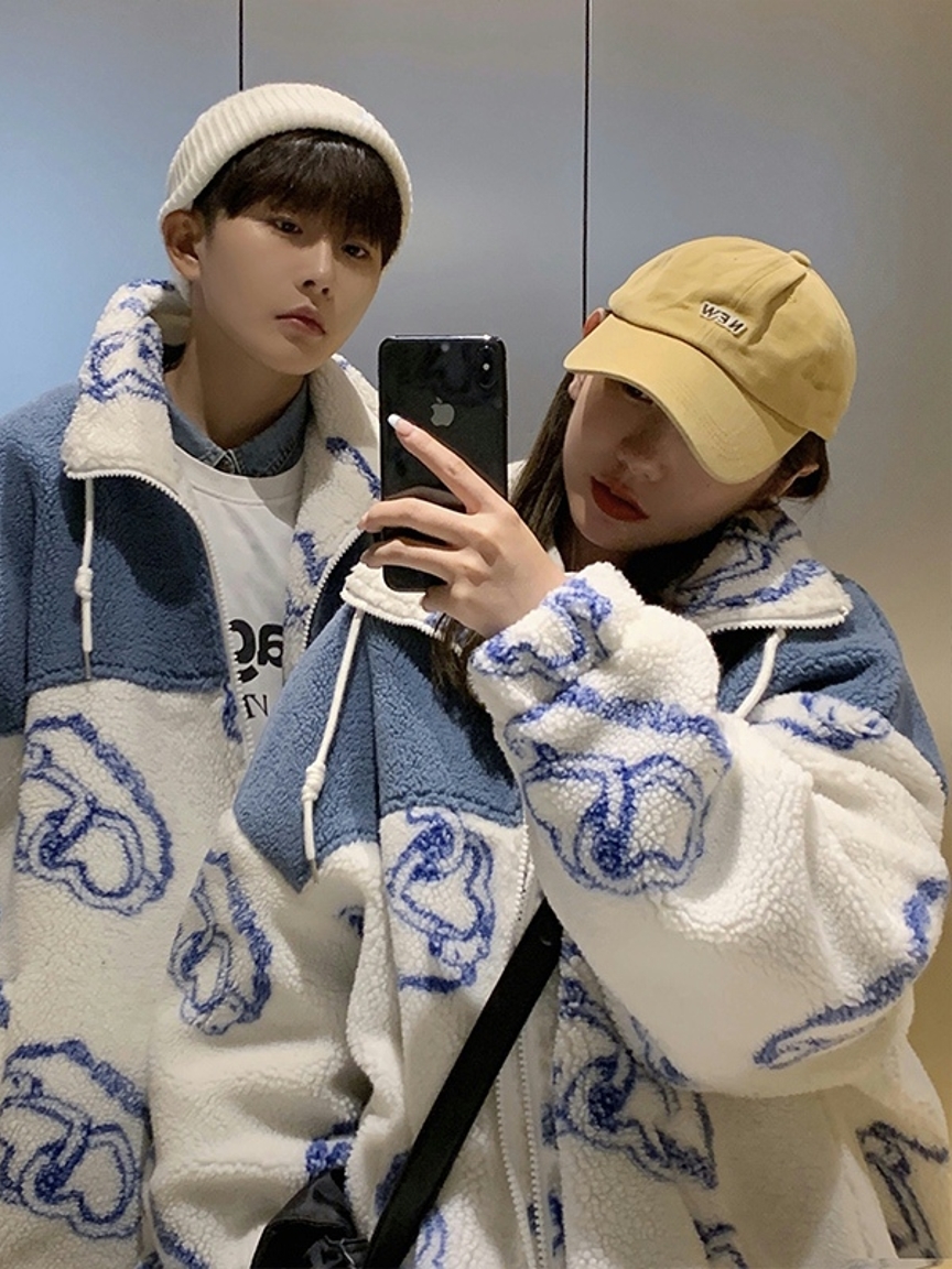 一款韩范儿十足的羊羔毛卡通棉服,比较宽松的版型设计,对身材有很好的包容性,上身比较的遮肉显瘦。