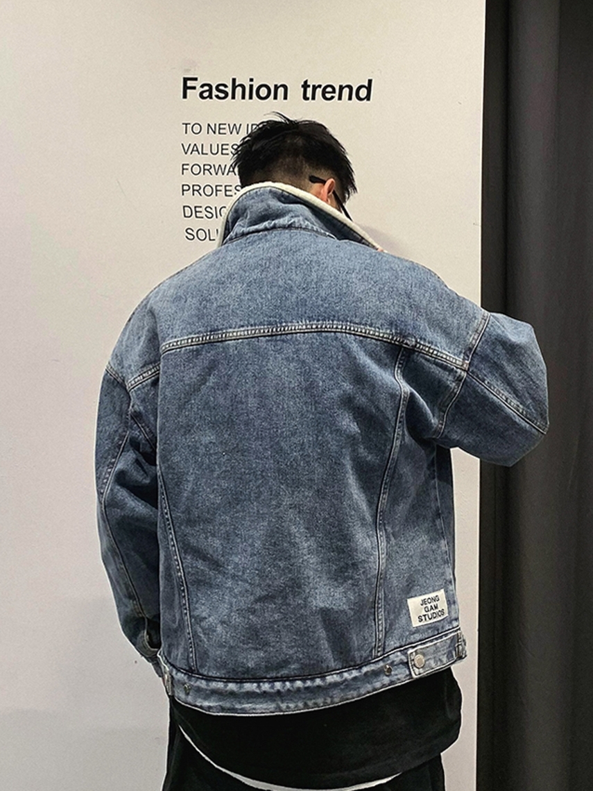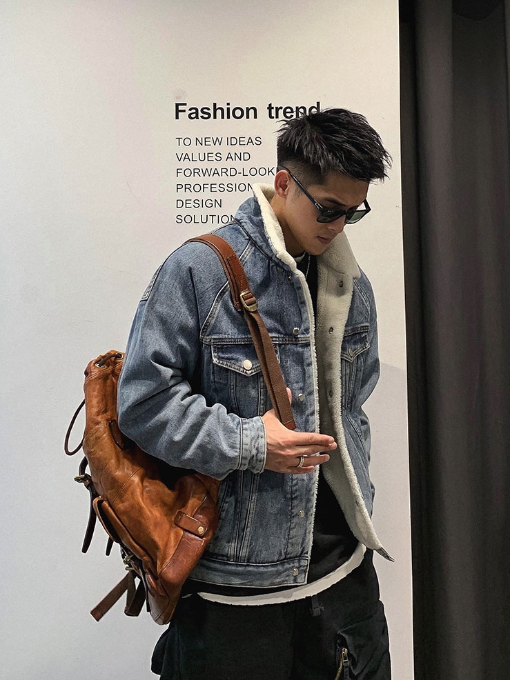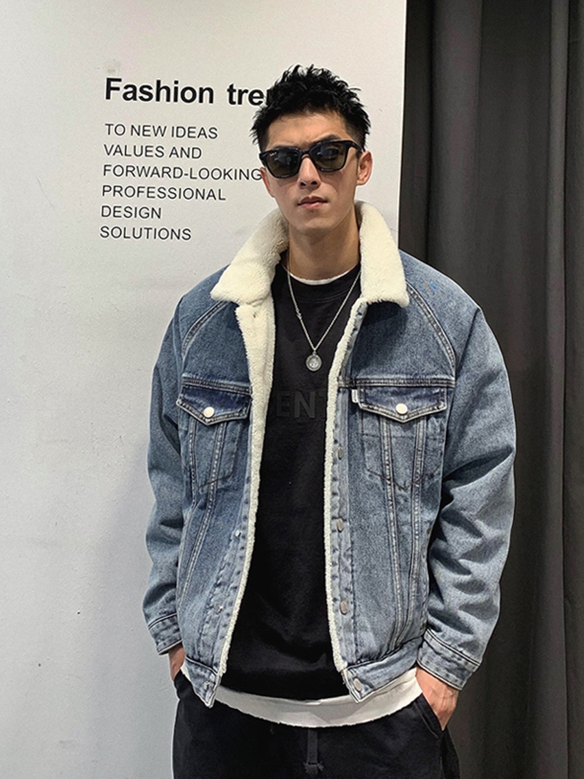 羊羔毛的面料更加的温暖而且翻领的设计也更加的时髦,牛仔面料的运用让这款棉衣更加的时尚感和街头风。