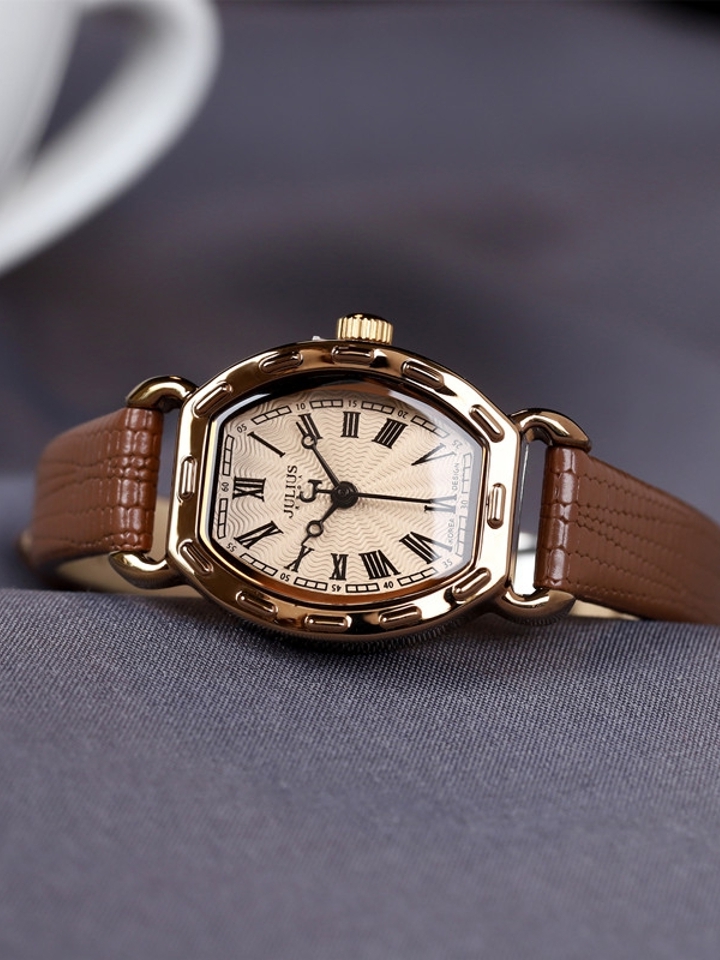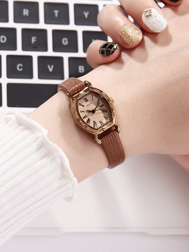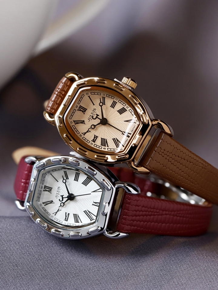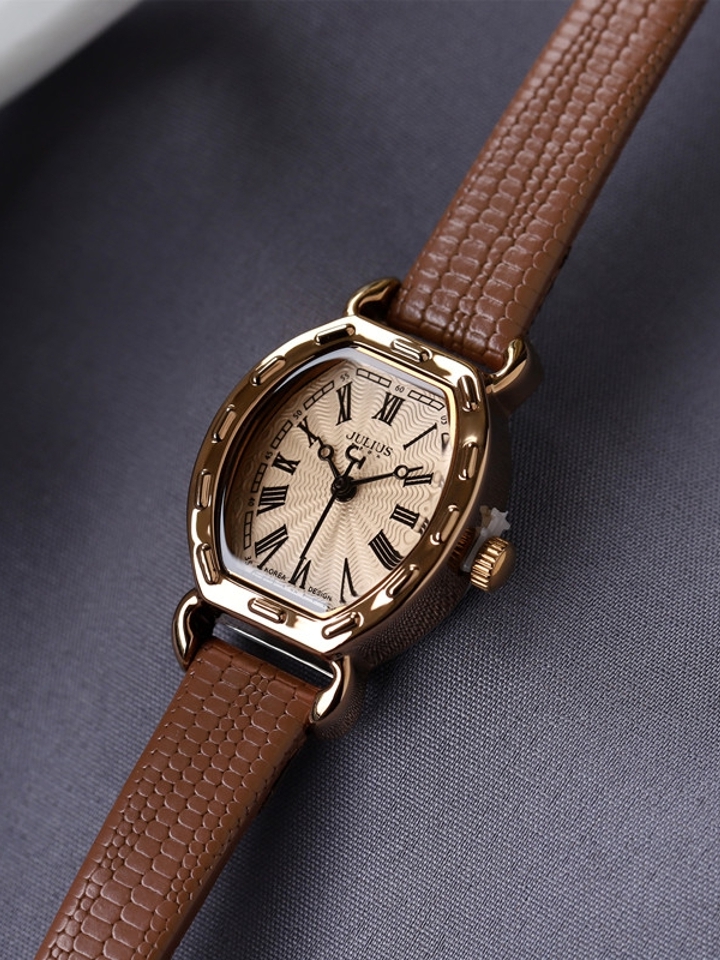 真皮表带的手表,在当下来说是很常见的一种款式吧,长方形的表盘设计,采用了弧形的处理,整体效果看起更加柔和,表面凸起感的点缀,美观又时尚。