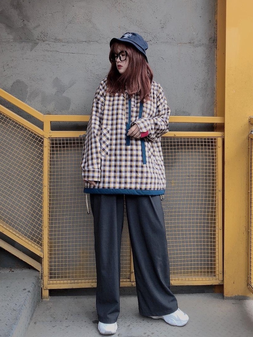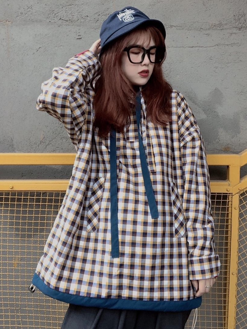 经典格子元素,复古时尚,夹克版型,穿着帅气有型,风衣版型设计,挺括有型,宽松版型,穿着舒适自在,经典复古风格,时尚潮流,羊羔绒面料,舒适又保暖。