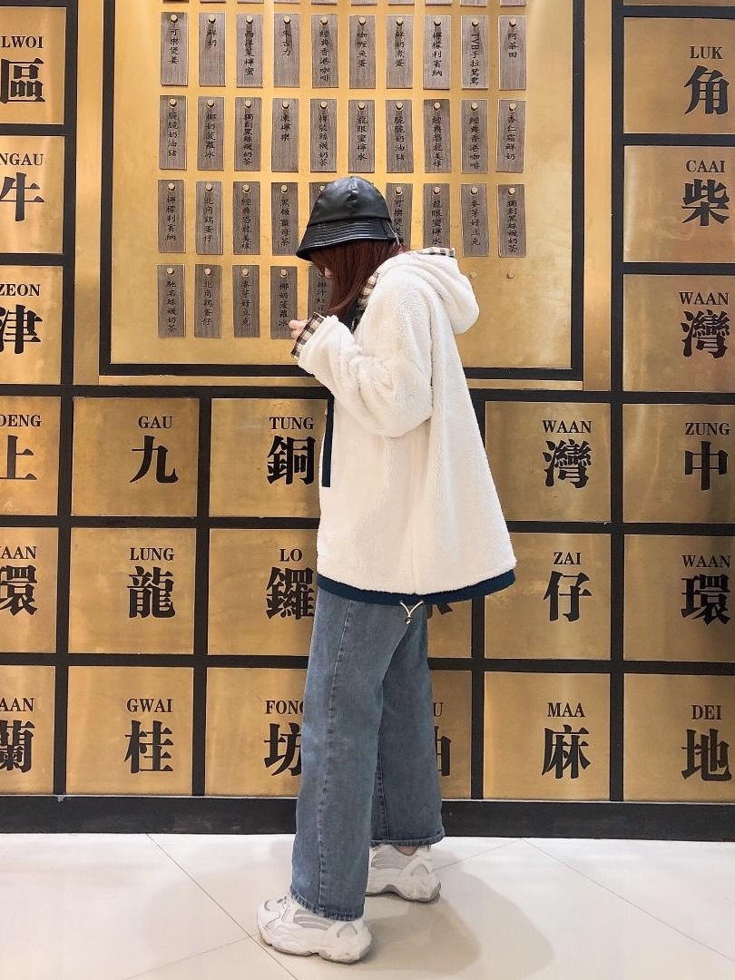 这款外套采用了羊羔绒的材质,内里夹棉,保暖效果很好,经典的格纹元素,搭配上经典格纹,很有英伦范儿。