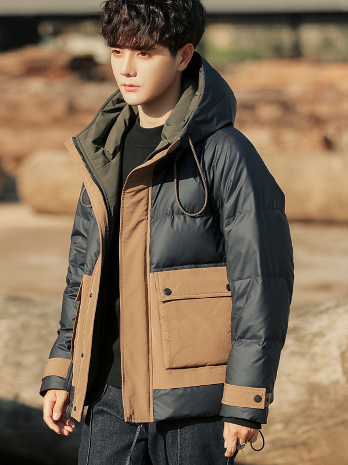 基础的羽绒服版型设计,穿在身上个性而且不臃肿。上身可以搭配一件中色系毛衣,使穿着效果看上去舒适而潮流,视觉效果也更加丰富有质感,勾勒出身材的同时也更加有潮流范。