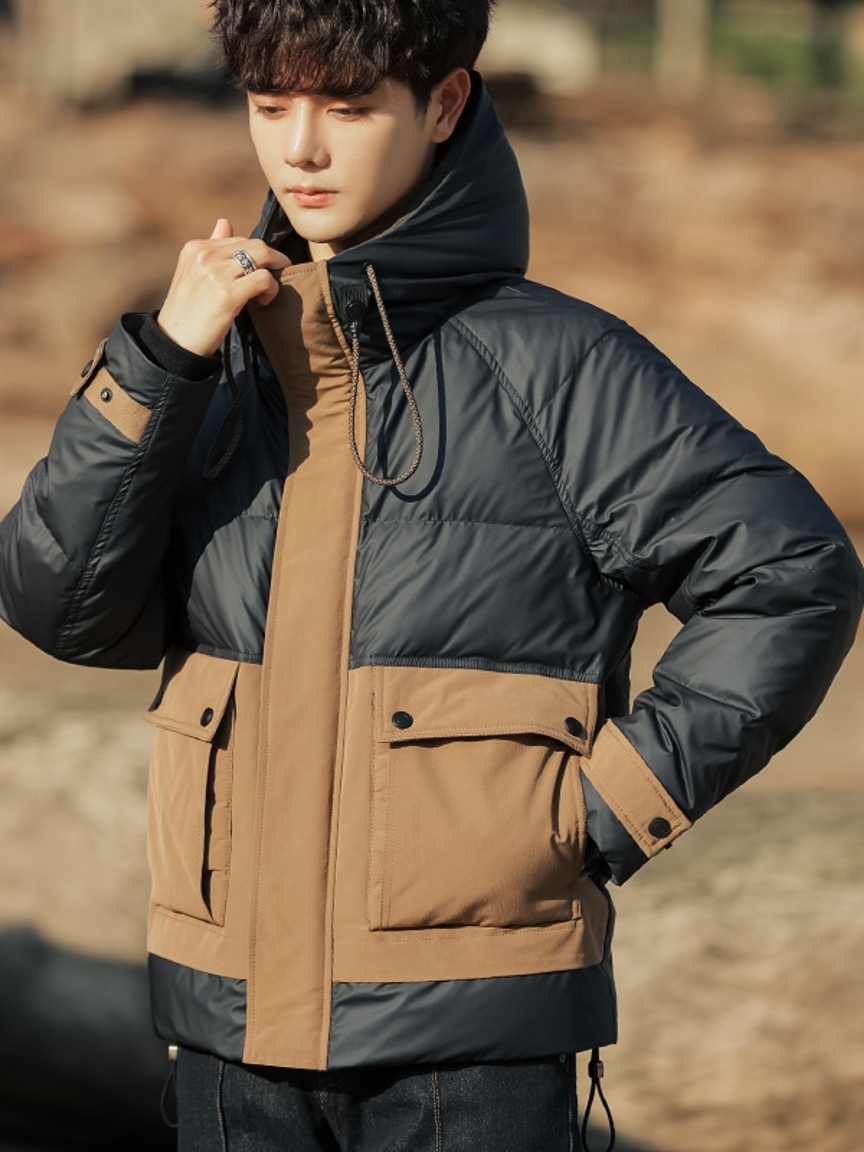 这款羽绒服的衣身采用的是撞色拼接处理,为衣身增加了时尚气息,尽显潮流美感。领口采用的是连帽的设计,看上去满满的造型感,时尚感十足。肩部宽松的落肩款式,包容性极强,一点都不挑身材。
