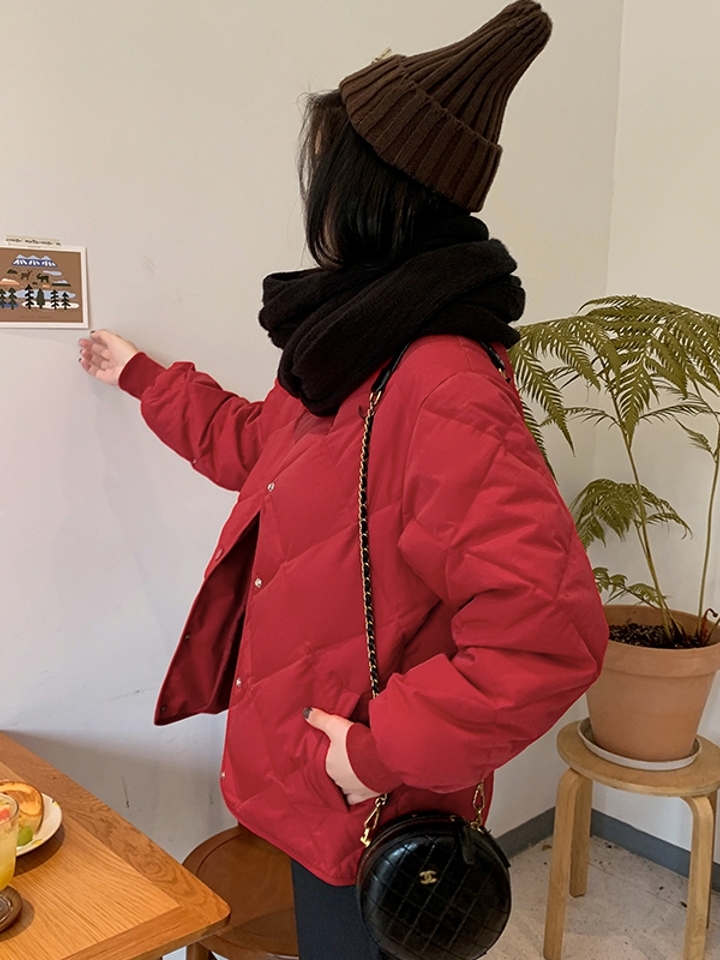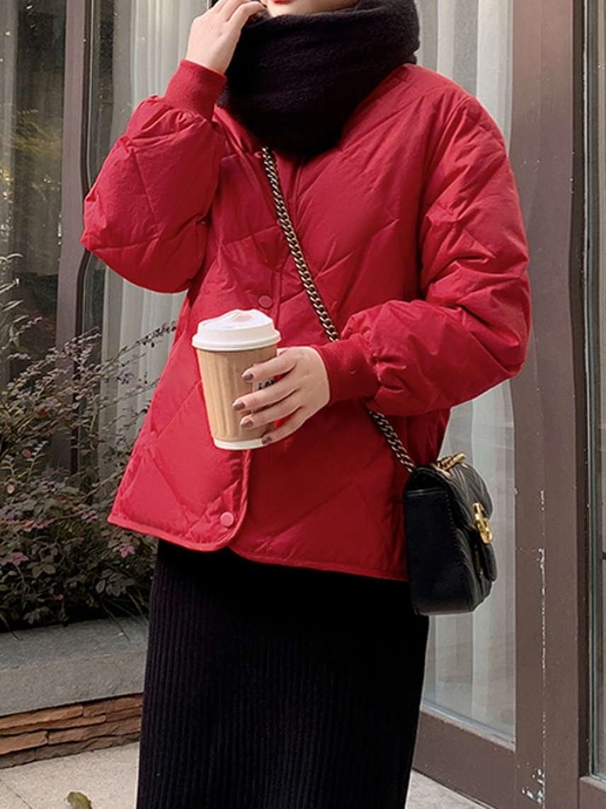 轻薄款羽绒服,内外面料色彩强烈的撞色,让整体衣服更显年轻活跃,青春减龄。小个子女生适合穿这种短款式。