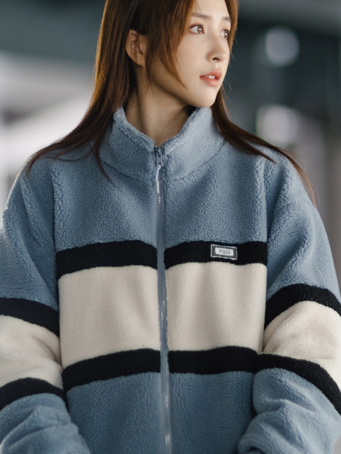 复合羊羔绒的短款夹克,两个颜色拼接,淡蓝色淡淡的,抢眼又不会落俗,白色经典耐看,小宽松的版型,上身帅气有型,厚实的面料,保暖又舒适~