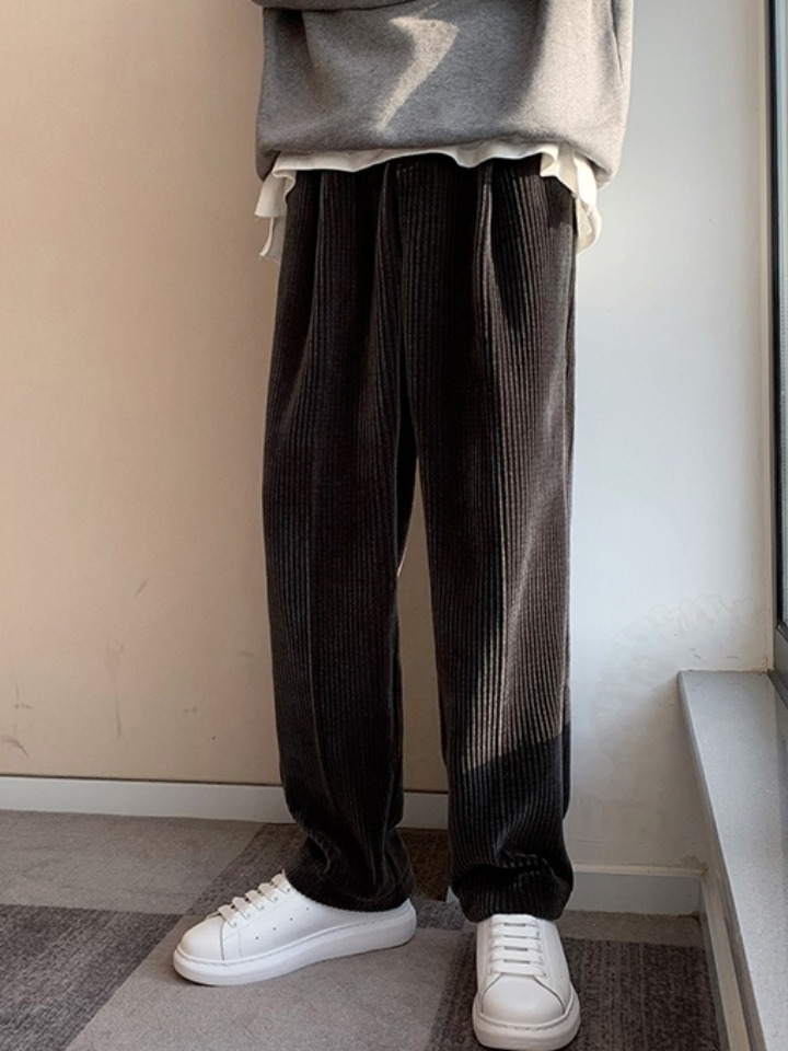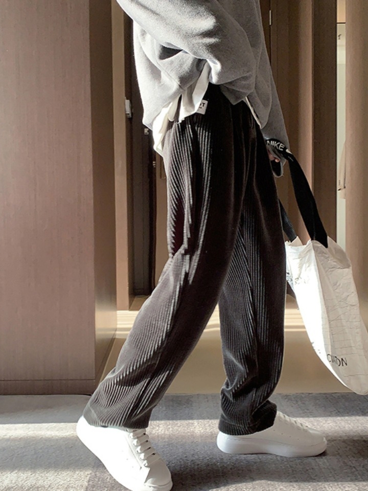 带有复古气息的一款灯芯绒休闲裤,经典的配色,搭配竖条纹的肌理元素,能展现出潮流时尚的气息,穿起来更加酷帅。