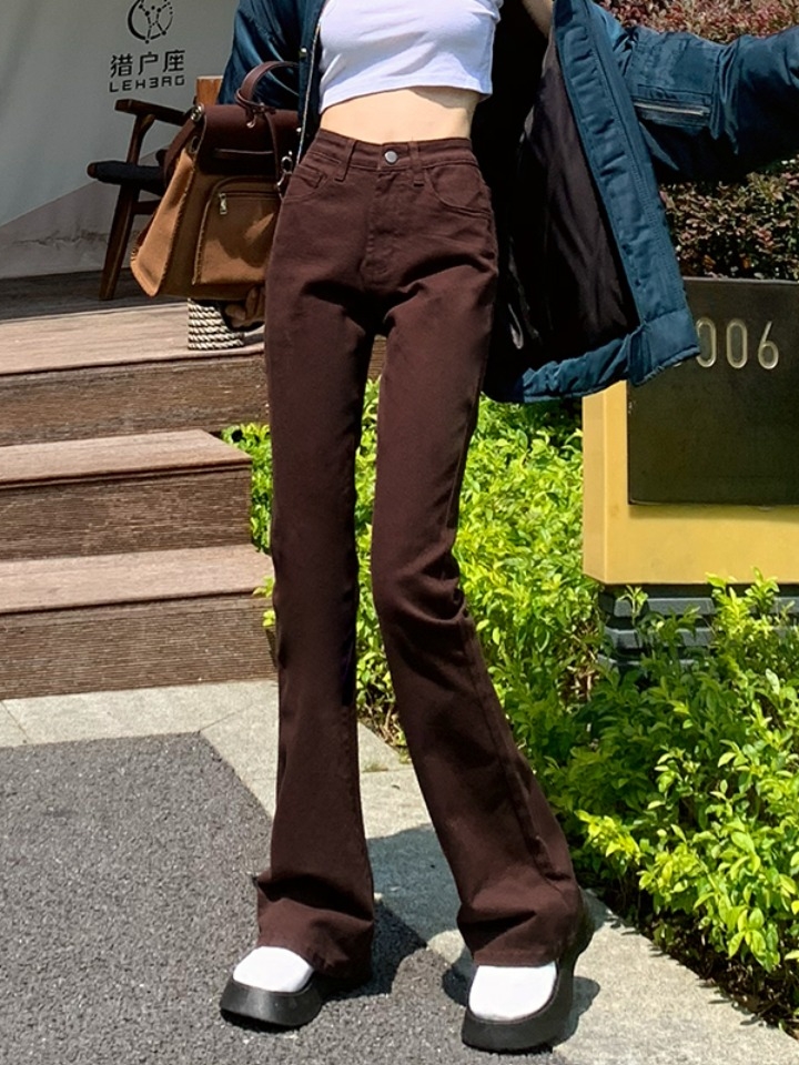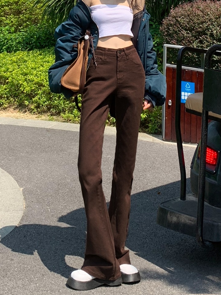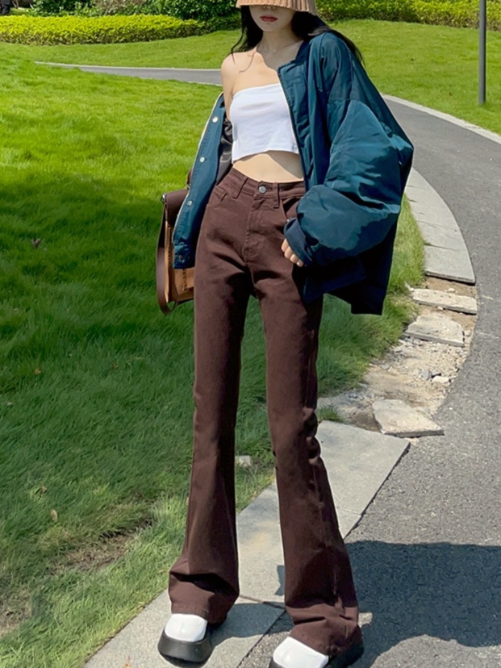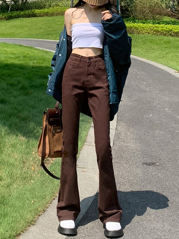 棕色的微喇叭牛仔裤,能带出一股欧美风的气息,穿起来时髦感倍增,而且它有小个子版、正常版或高个子版可选择哦。