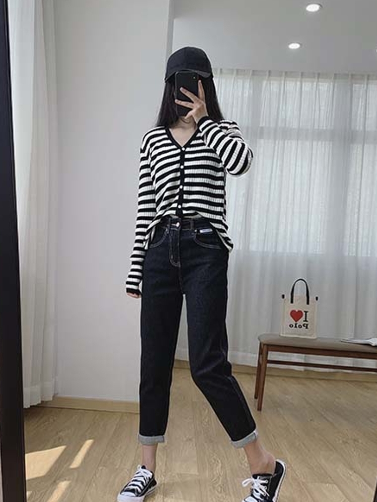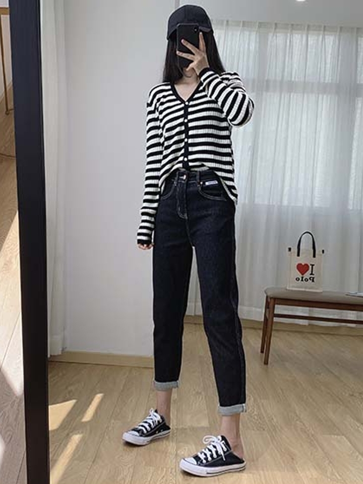 秋冬季这样穿也很时尚啦,上衣配一款条纹针织衫,满满的休闲味道,再穿一双帆布鞋,逛街或是上班都很吸引眼球。