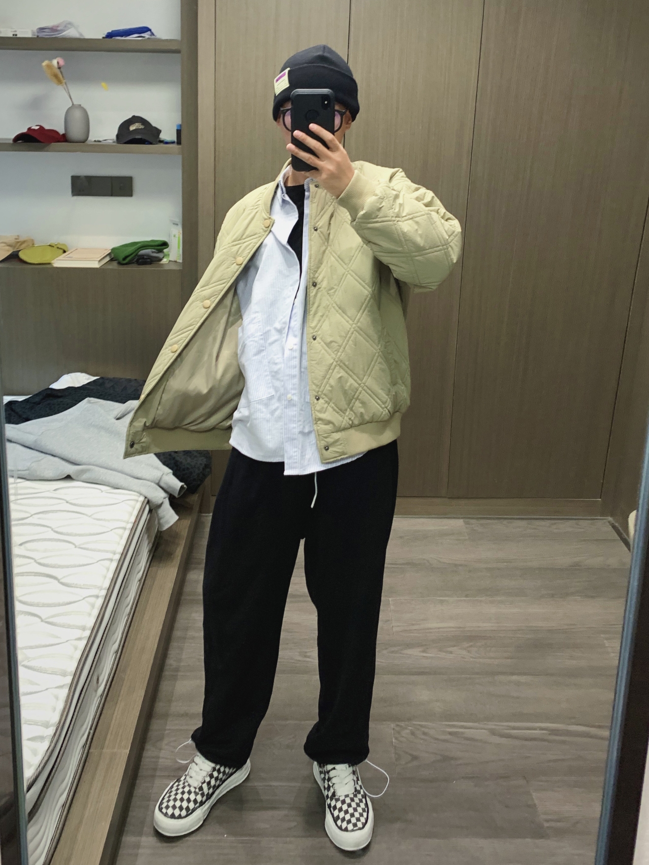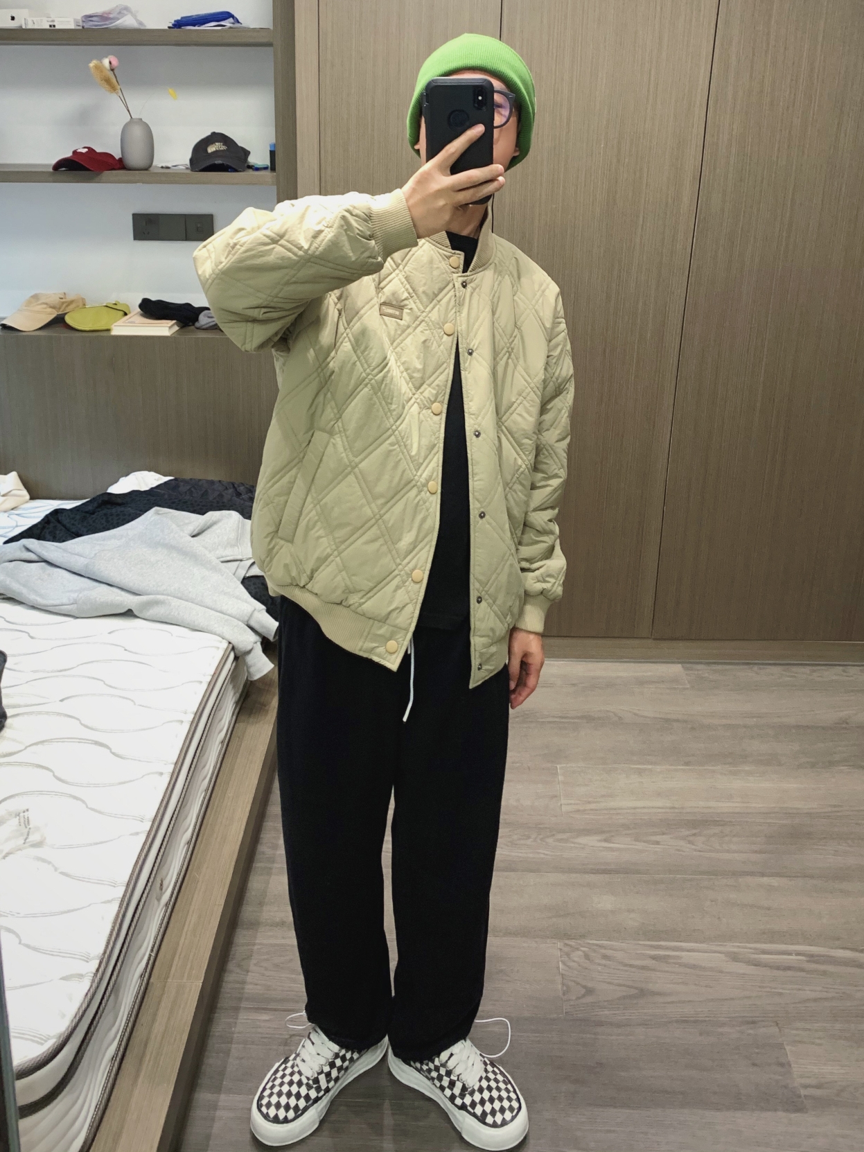这款棒球服外套很百搭,在搭配的时候,可以选择一件黑色T恤作为内搭,再配上一条黑色的休闲裤,搭配一双棋盘格休闲鞋,很是美观时尚。