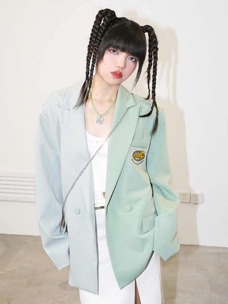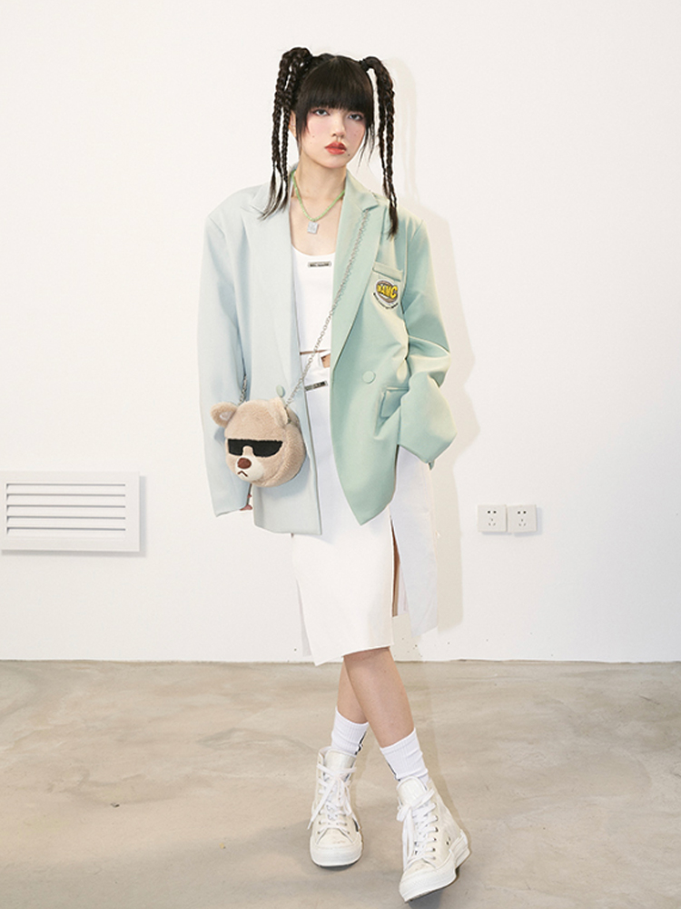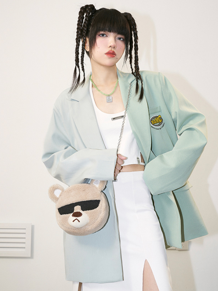 这款MAMC挎包熊西装外套,在设计上简约大气,清新淡雅的绿色拼接,彰显出复古的韵味,上身更显优雅大方。