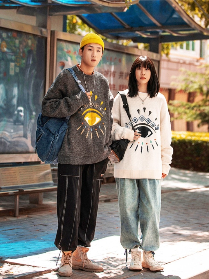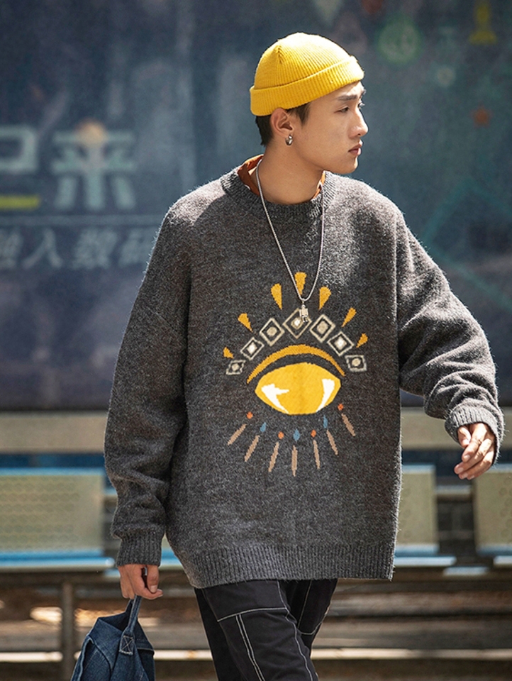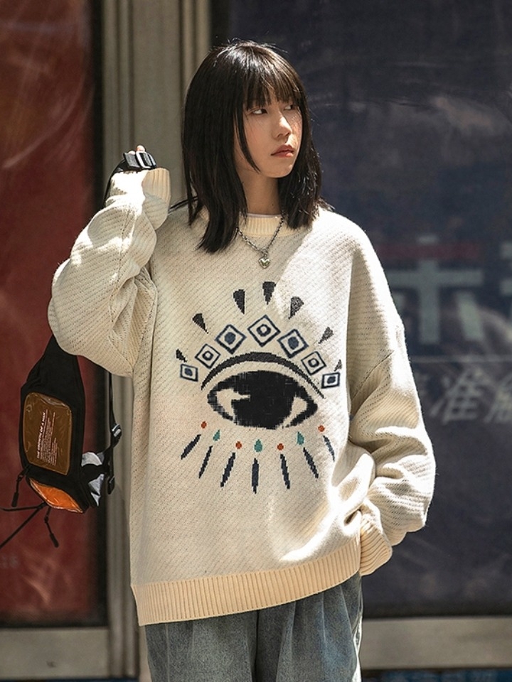 眼球提花毛衣,彰显时尚潮流感,轻松打造美式街头个性感!可以与束脚裤和高帮鞋相配,拎上双肩包,就可以休闲出行。