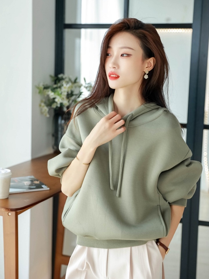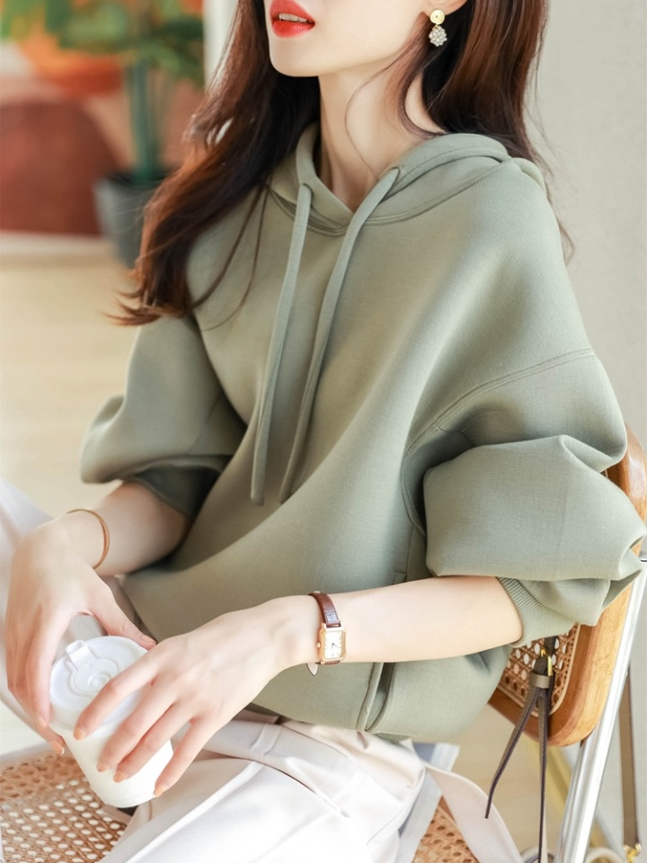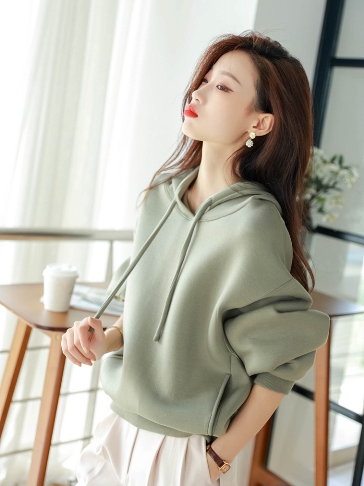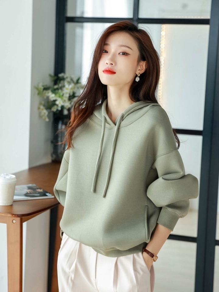 青提慕斯色系的卫衣,颜色清新减龄,能给人眼前一亮的感觉,搭配白色休闲裤,很有少女的味道,简单却很养眼。