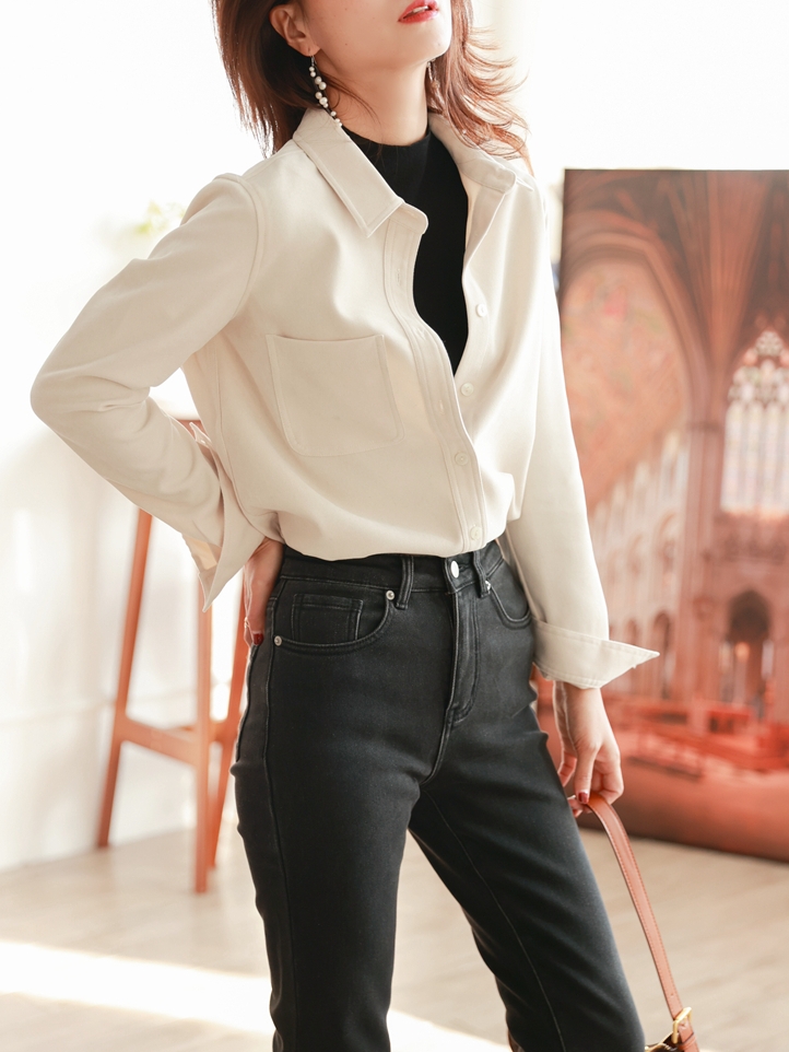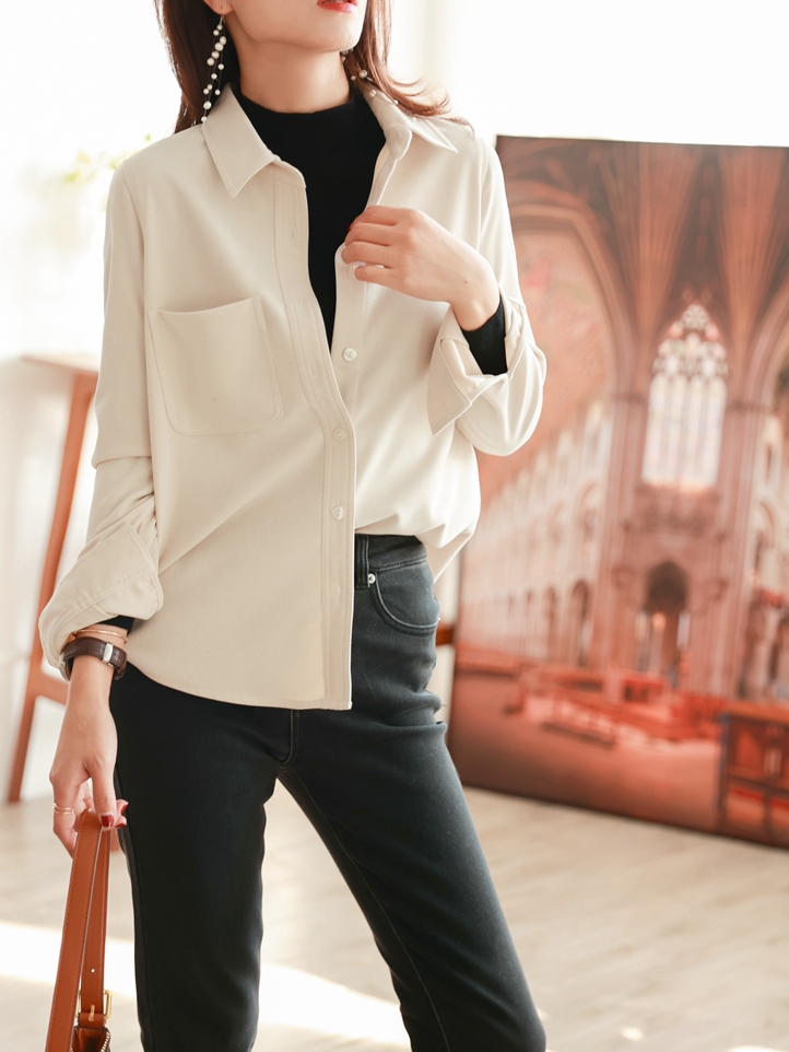 这件白色的灯芯绒衬衣看上去十分的简约,宽松的版型,上身挺阔还比较的有型,比普通的衬更加厚实,更适合在秋冬进行叠穿或者单穿搭配。
