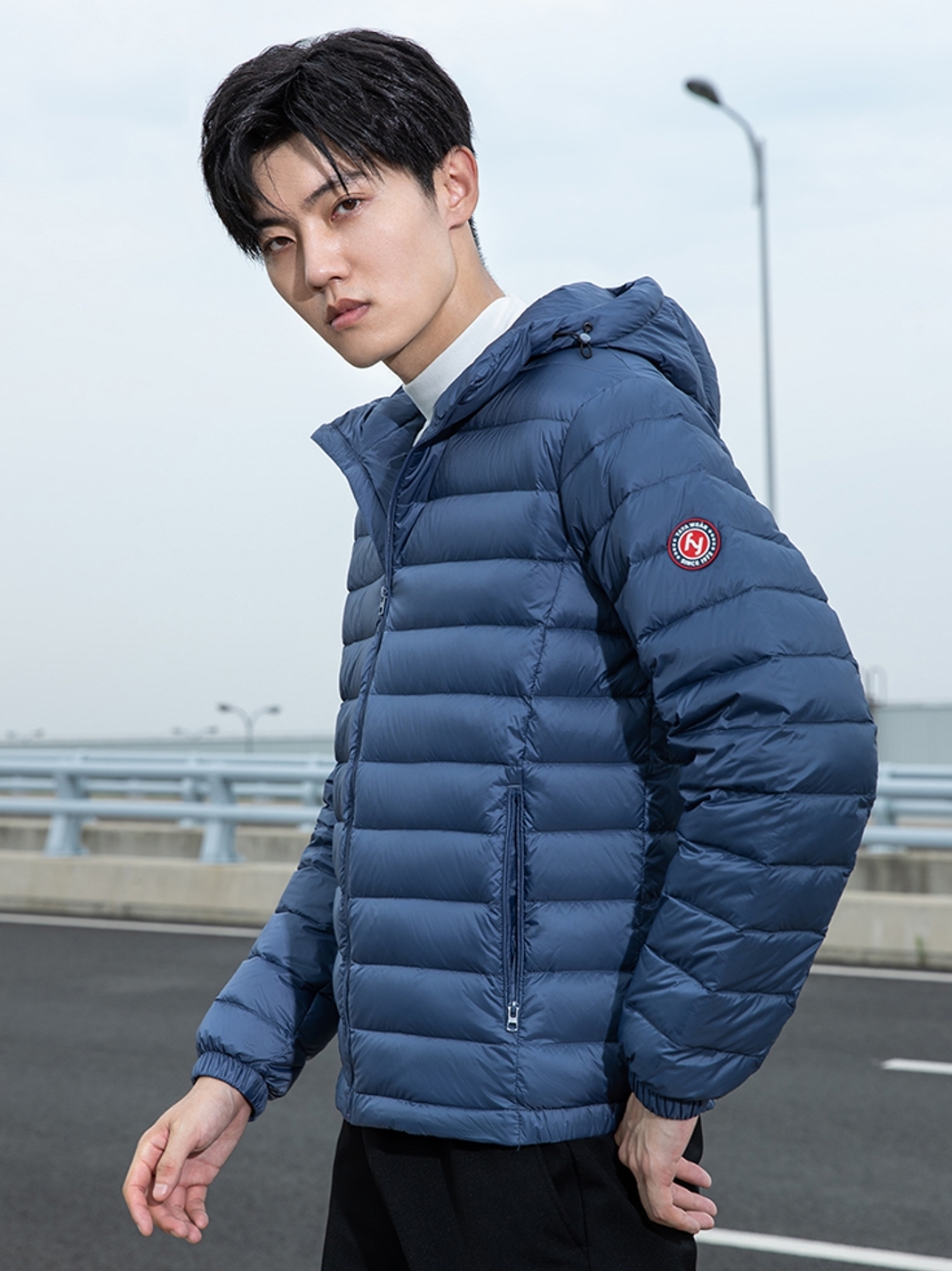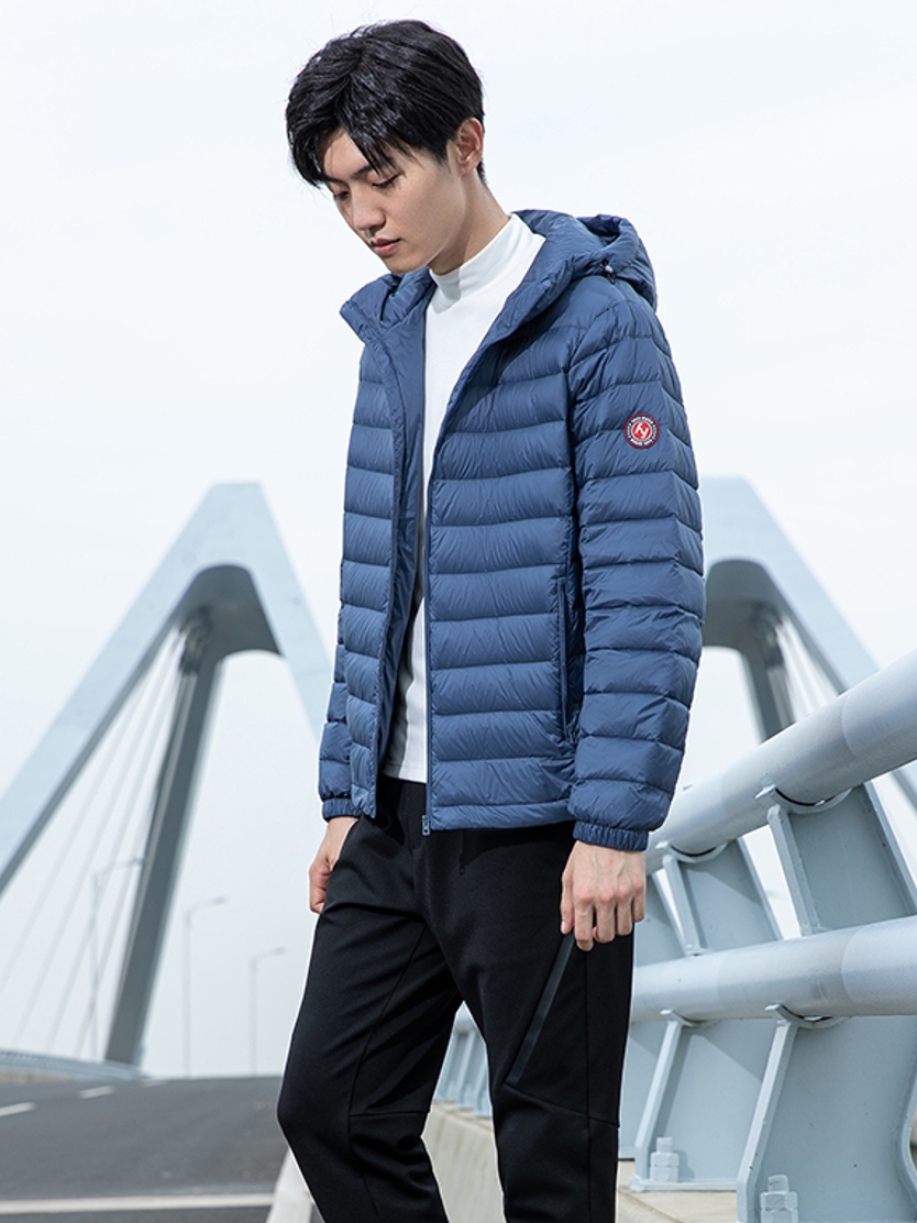 短款羽绒服,浅色调提升男性沉稳大气的品质,轻薄质地搭配未来感的光电子科技带来最舒适的温暖体验。搭配一条黑色束脚裤,一顶保暖毛线帽,一双户外运动鞋,整套完美的户外搭配中凸显出时尚造型。