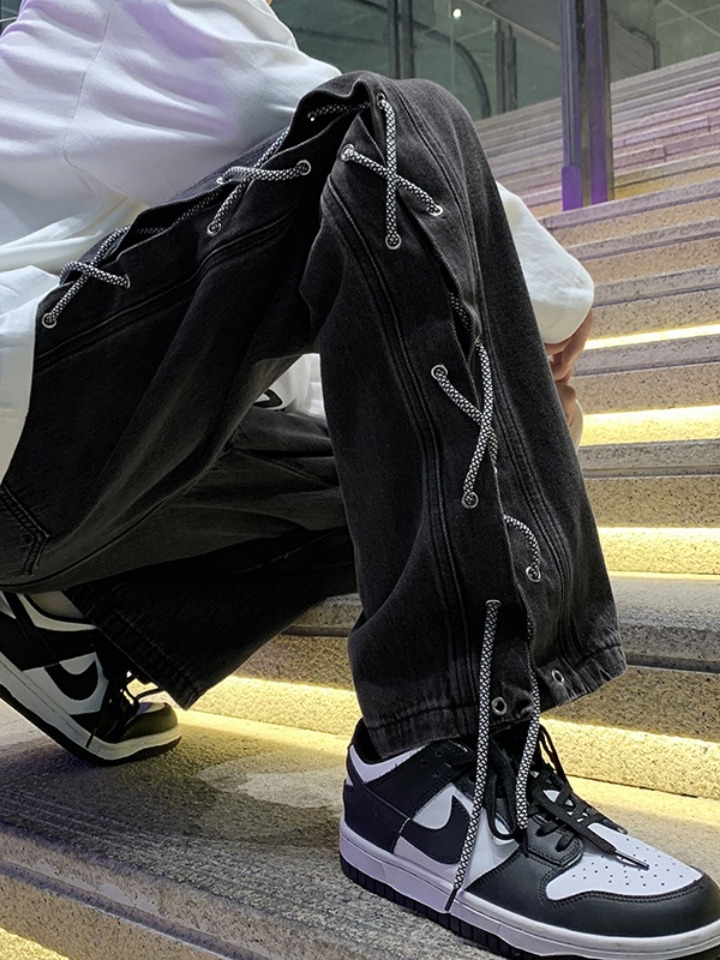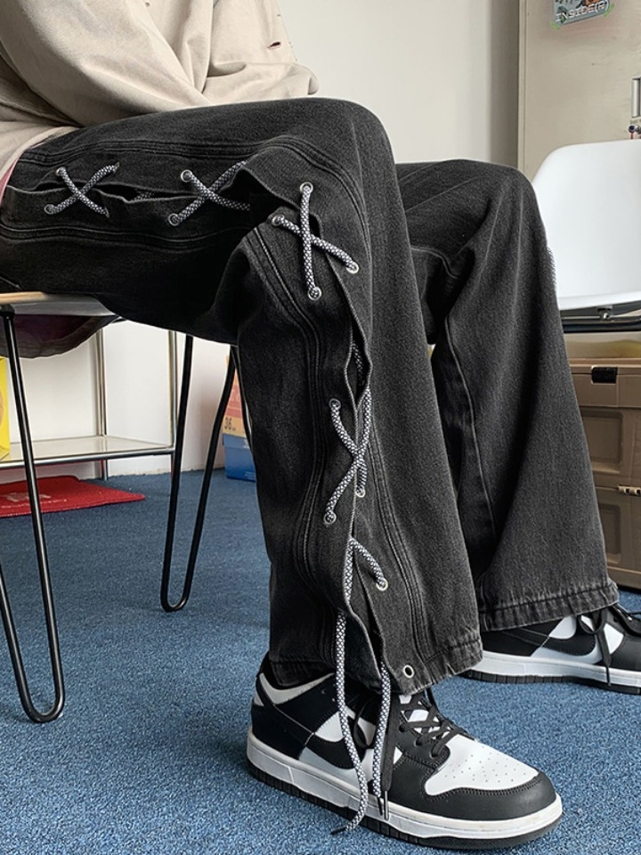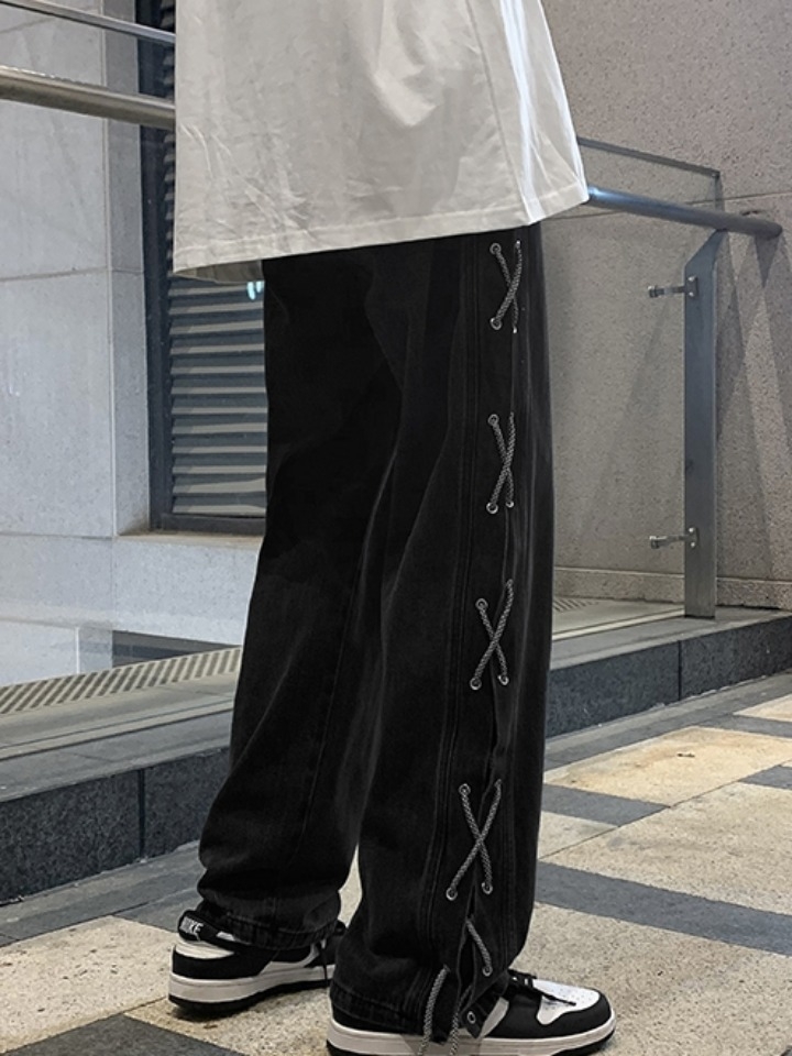 绑带的设计会让你的搭配变的很新鲜不一样哦,腰围属于中腰的上身显瘦到不行!还有裤腿的金属气眼和绑带的设计真的很繁琐,再加上牛仔裤的洗水和裤脚磨破工艺,视觉上看起来也超级显瘦,又潮又帅气~
