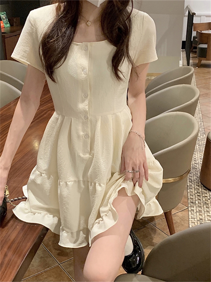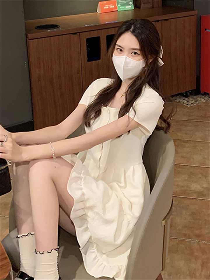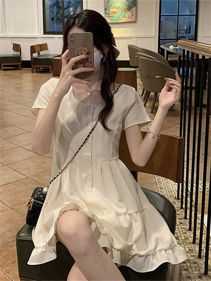 服非常不错,穿起来很温柔淑女,个人气质也提升了起来,真不错,子材质是不会皱的那种,方领和杏色显知性,裙摆设计复合少女心。