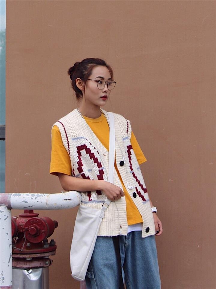 经典格纹元素,复古时尚,复古风格,彰显时尚魅力,无袖设计,修饰手臂线条,菱形图案,彰显个性时尚,宽松版型,不挑身材穿着,宽松的针织衫,穿着舒适。